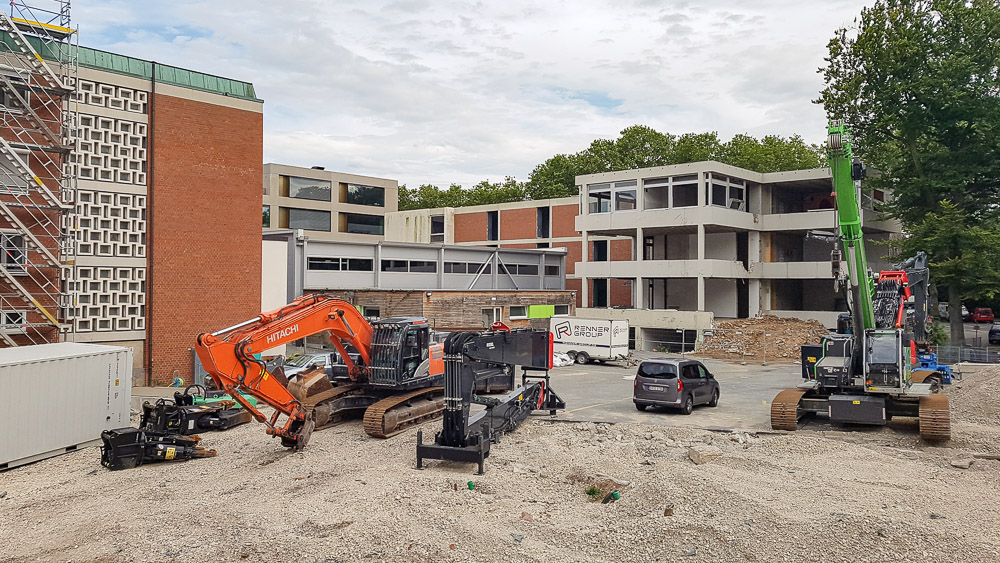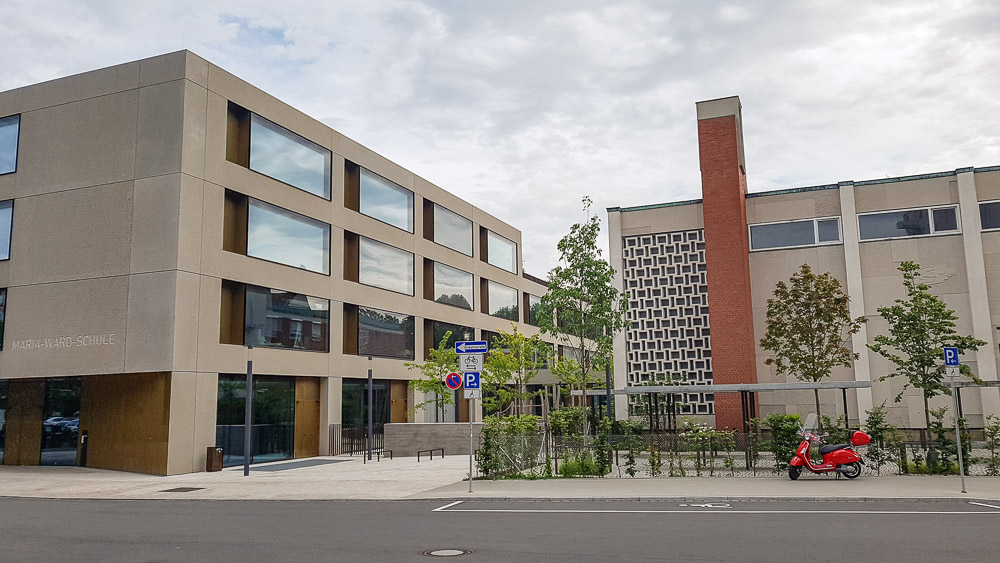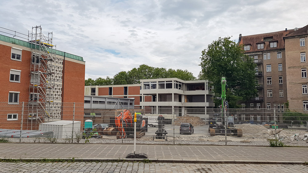 Da unlängst einmal in einem NN-Artikel (nur Printausgabe) die Rede davon war, dass der vordere Gebäuderiegel entlang der Bucher Straße abgerissen werden und nach Möglichkeit aber ein Bestandsgebäude erhalten bleiben soll, habe ich den Eindruck, dass es sich bei letzterem um die rechts zu sehende Lager-/Fertigungshalle handelt. Der Komplex insgesamt kommt zwar nüchtern daher, gefällt mir aber mit seinem hohen Fensteranteil, der Varianz in der Fassadengestaltung und den links beim Neubauflügel angedeuteten diagonalen Gebäudefluchten ziemlich gut.
