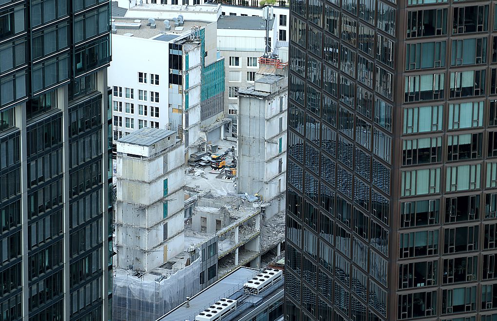 Es würde mich nicht wundern, wenn sie am Schluss auch abgerisssen werden.Da man aktuell schon vier von acht Stockwerken abgetragen hat, ist man auch auf der Westseite (links) schon unter dem Level, das zumindest im Vergleich mit dem Vorgängergebäude für einen Teilabriss geeignet gewesen wäre. Auf allen anderen Seiten sieht der neue Grundriss anders aus, als zuvor.