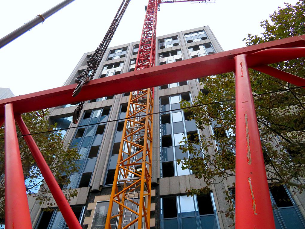 Die Arbeiten am 2stay/Indigo sind nun von außen erkennbar. Ein Fassadenaufzug ist angebracht, die ersten Fenster sind herausgenommen. Davon ein Handy-Schnappschuss durch das Autodach:
