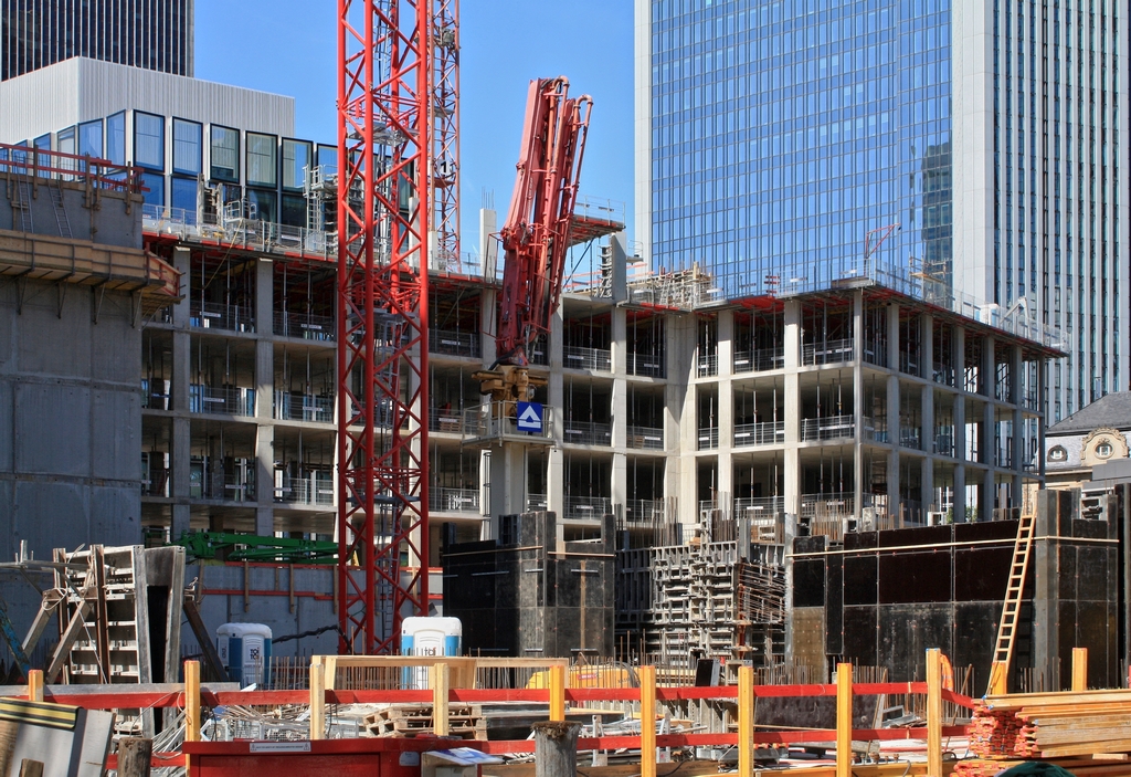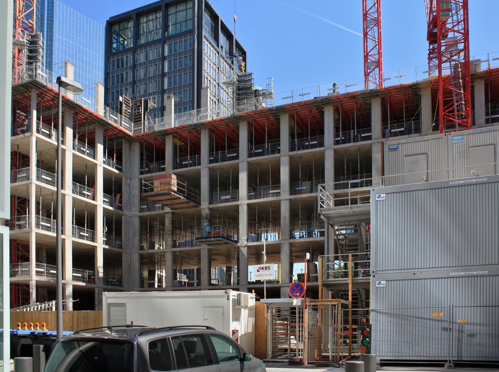 Der Bewehrungsstahl am vorwachsenden Kern (um die rosafarbene Betonpumpe) ragt bereits ins 2. OG hinein. Trotz großer Grundrissfläche und obwohl nicht mit Fertigbetonteilen gearbeitet wird, kommt der Rohbau des Turmes sehr zügig voran: