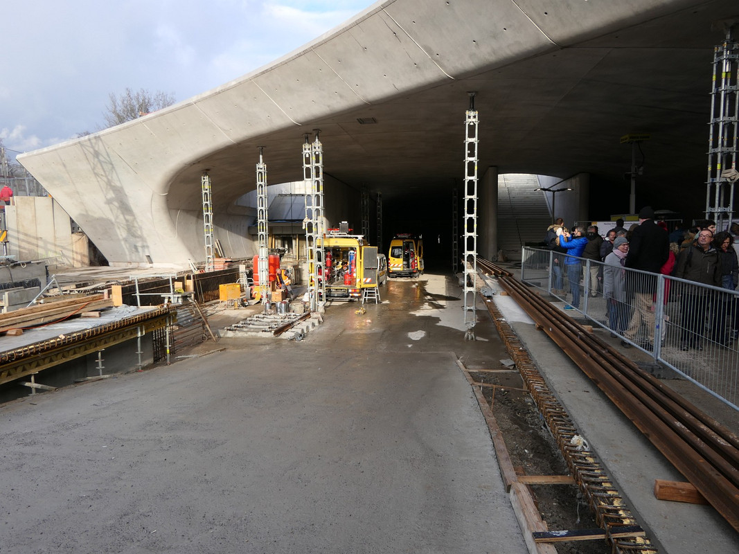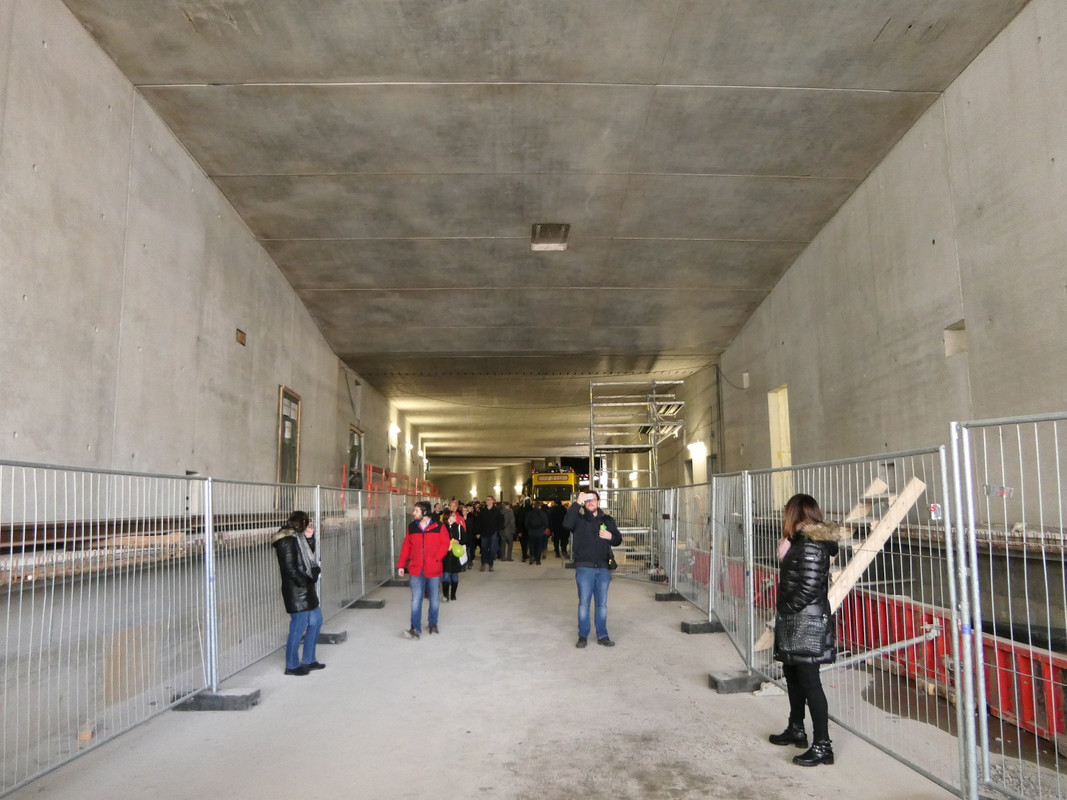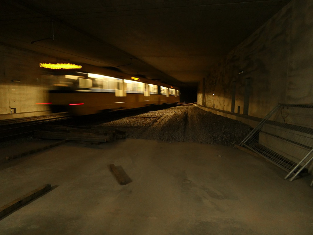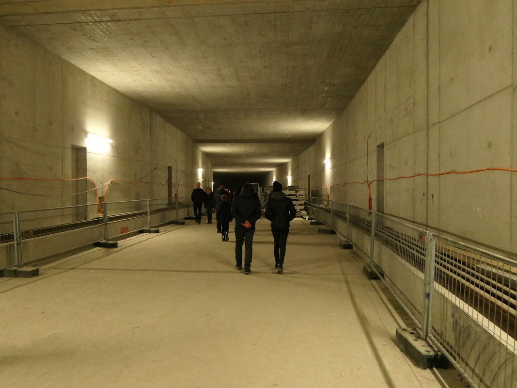 - existierende "Vorleistungen" wie der Tunnel, welcher sogar breit genug für drei Gleise betoniert worden ist, und die in einem Trog liegende Station selber. Allzu viel tiefer hätte man hier gar nicht mehr graben müssen, um auch einen Deckel drüber ziehen zu können. Der größte Aufwand wäre tatsächlich noch die Technik gewesen.