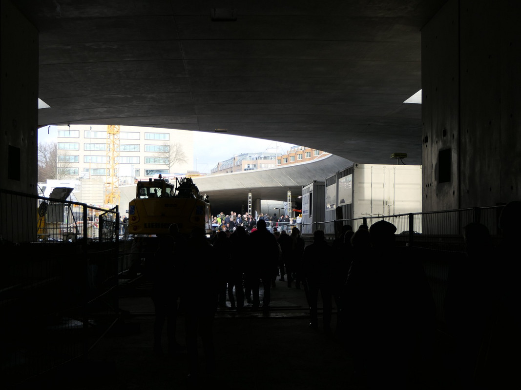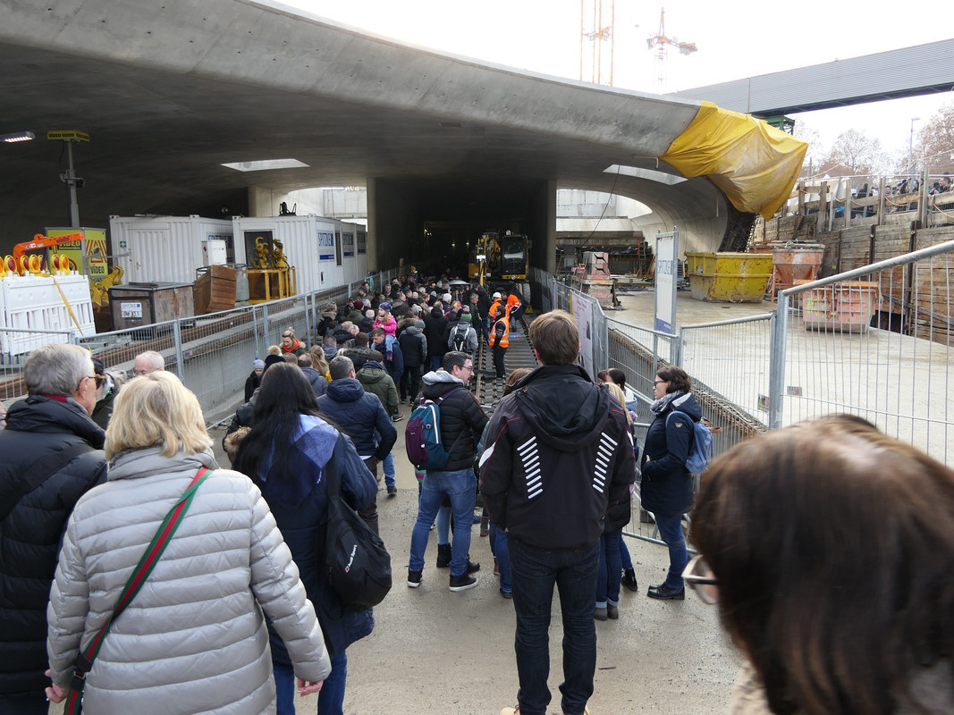 Nun noch ein Blick hinein in den U-Bahnhof, mit Blick auf den Mittelbahnsteig, Treppen, Aufzugschacht. Die Bilder sind vom Tag der offenen Baustelle, also von Januar 2020.