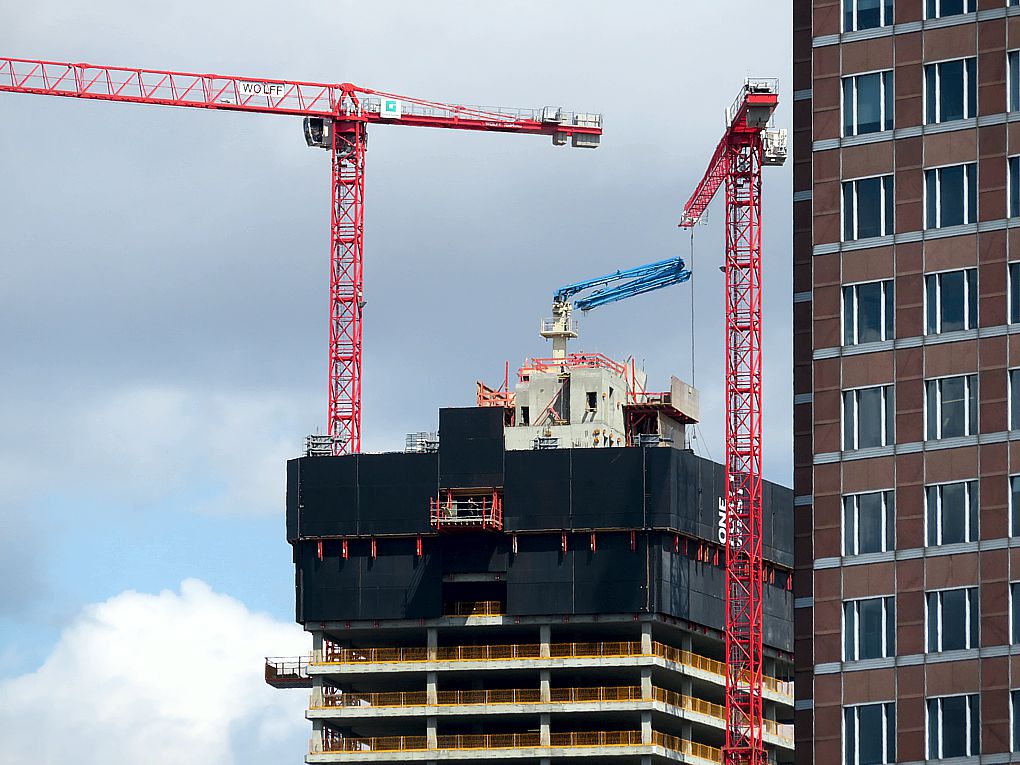 Der "One Forty West" hat eine Verkleidung der Techniketagen zwischen Hotel- und Wohnteil erhalten. Auf dem Baufeld des "99 West" sind weiterhin Maschinen für Gründungsarbeiten zu sehen.
