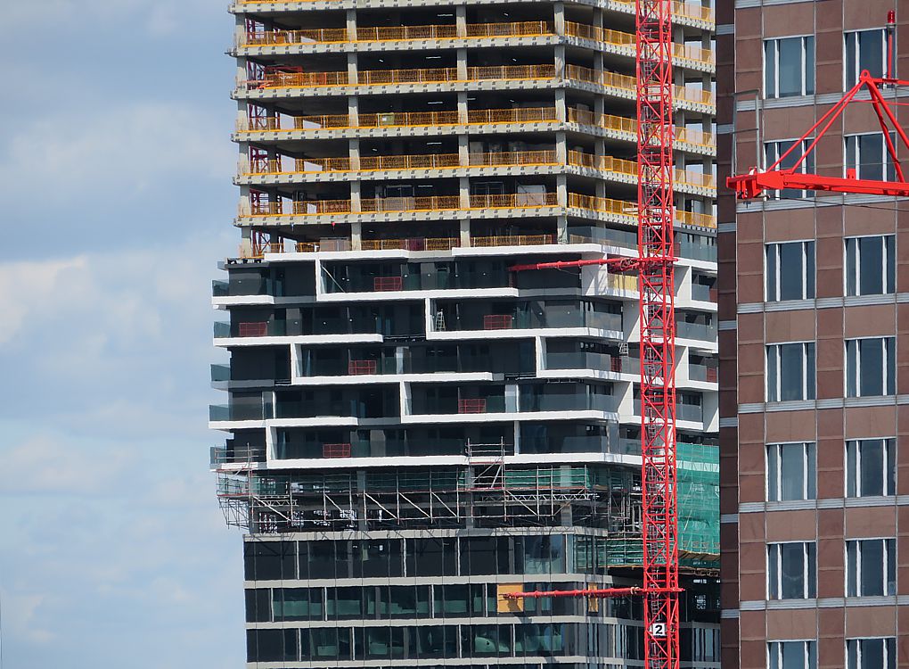Der 140-West-Rohbau steht, die Fassade bedeckt jetzt ca. 2/3 des Hochhauses. Aus der Luft ist schon jetzt zu erkennen, dass sich der neue Skyline-Zugang gut in die Umgebung einfügen wird. Die weißen Balkoneinfassungen erzeugen einen unübersehbaren Akzent und machen das Bauwerk unverwechselbar. Auf die Fassadenfertigstellung dürfen wir uns freuen!