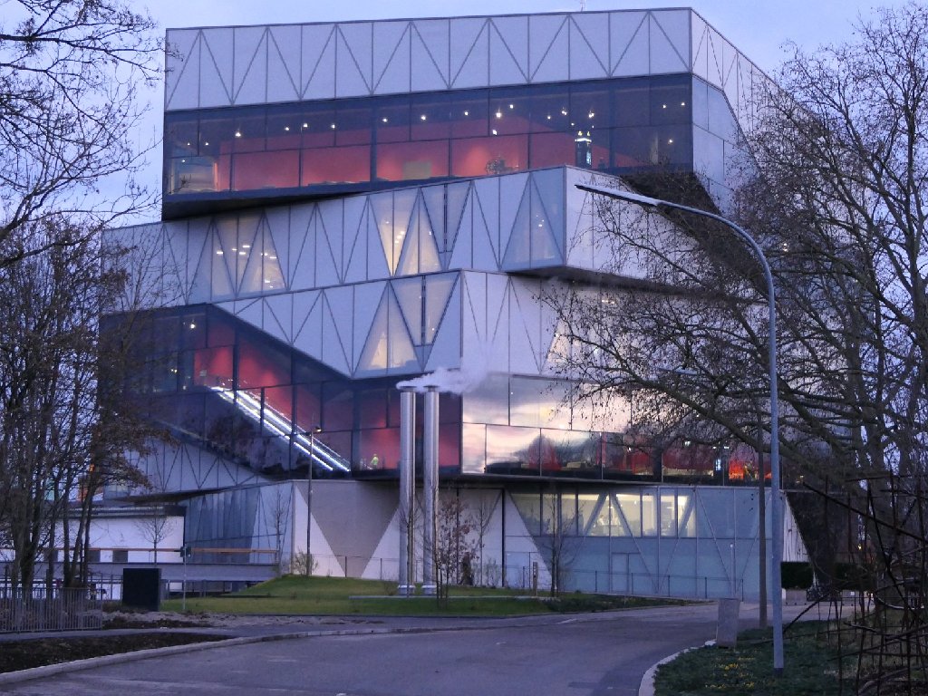 Die Fassade ist transparent längs des Besucherweges vom EG ins Dachgeschoss sowie abwechselnd transparent und opak bei den Ausstellungsräumen.