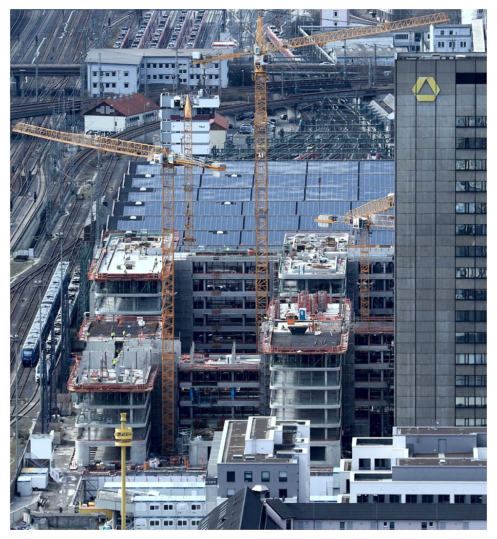 Ein schönes Detail werden die gebogenen Scheiben an den Ecken des zukünftigen DB-Netze-Gebäudes. Die weißen Rahmen der Fassadenelemente werden ebenfalls montiert: