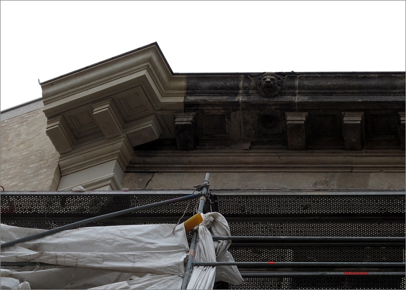 Der zerschossene Altbau mit der wuchtigen Sandssteinfassade (Am Kupfergraben / Ecke Dorotheenstraße), genau gegenüber der Baustelle der James-Simon-Galerie, ist seit geraumer Zeit eingerüstet. Inzwischen kann man in einer Lücke der Gerüst-Planen einen kleinen Bereich der (nun restaurierten?) Fassade erspähen.