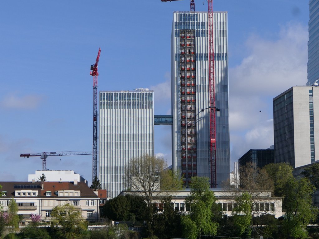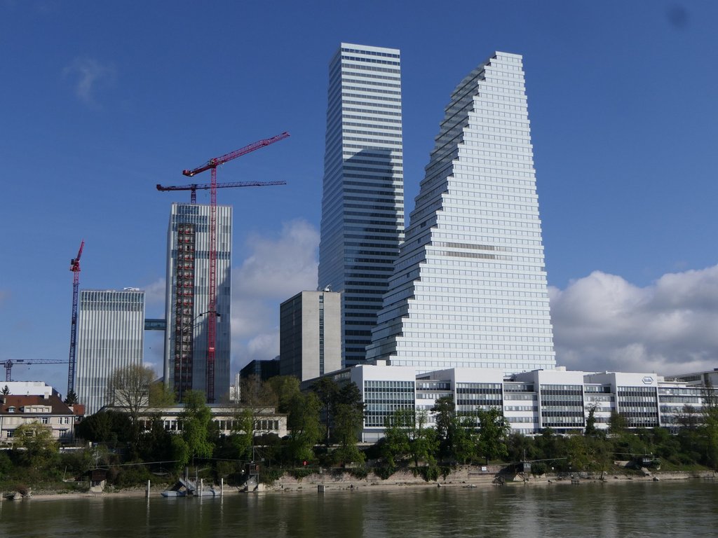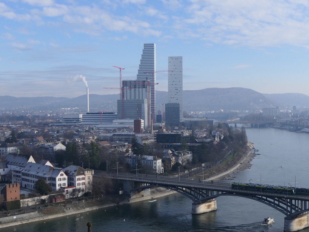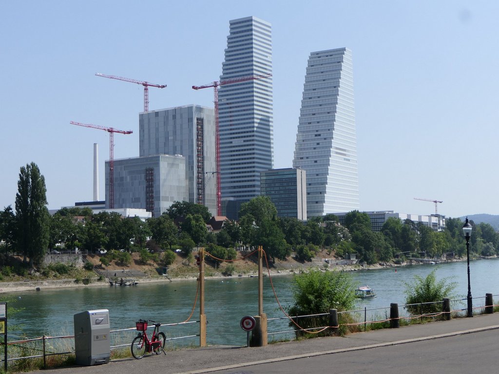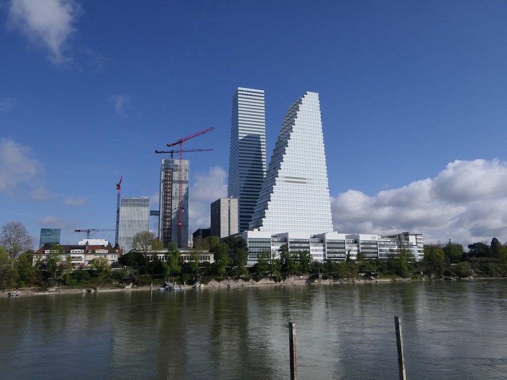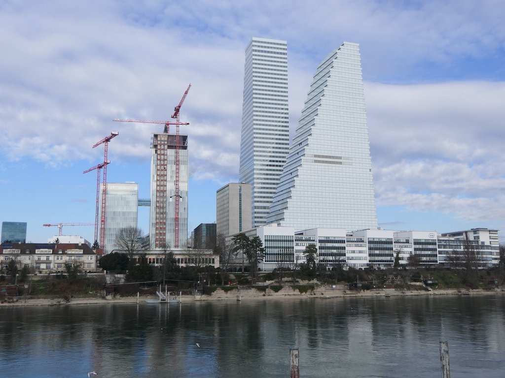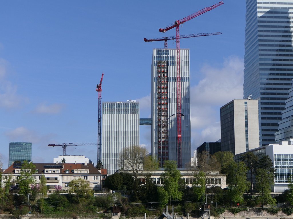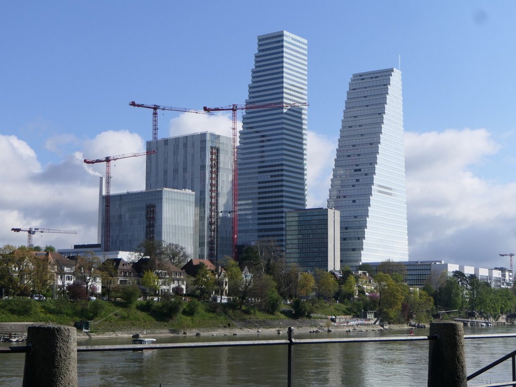 Übersicht mit allen nennenswerten (höheren) Türmen. Ganz rechts das Meret-Oppenheim-Hochhaus (81m) am Bahnhof SBB. Links davon der dunkle runde Turm der Bank für internationalen Zahlungsausgleich (70m) und hell daneben der Baloisepark (89m). Beide auf der anderen Seite des Bahnhofs am Centralbahnplatz. Etwa in der Mitte das 68m hohe Lonza-Hochhaus. Schon im linken Teil des Bildes, mittig über der Baumkrone im Vordergrund, der Claraturm (96m). Direkt dahinter versteckt sich der Grosspetertower (78m). Links davon dann der Messeturm (105m). Ganz links dann das Roche-Areal. 8 der (genannten) Hochhäuser auf dem Bild sind in den vergangenen Jahren entstanden!