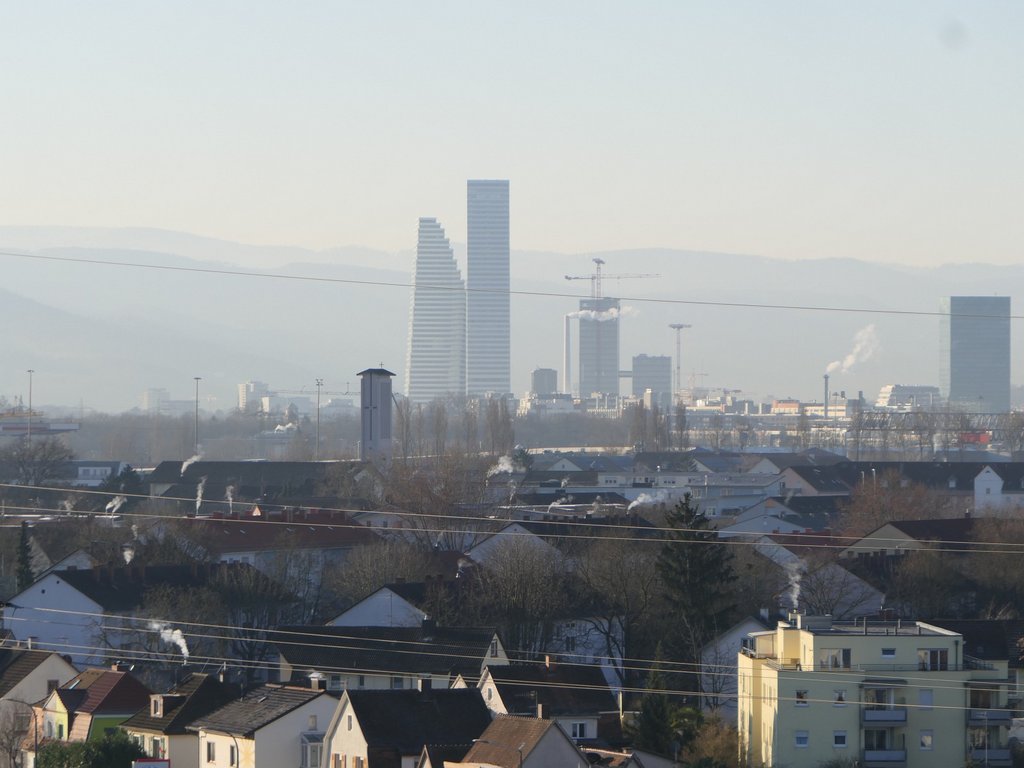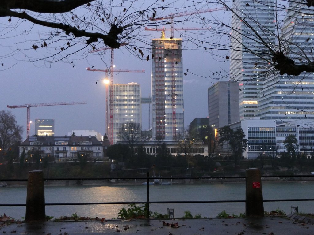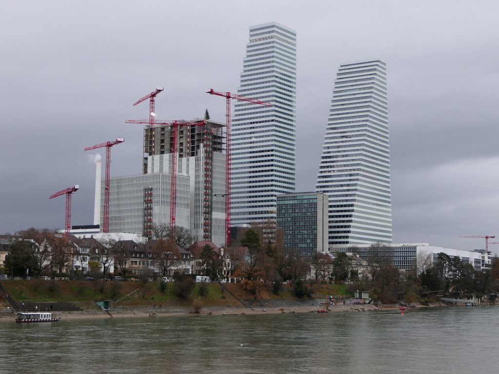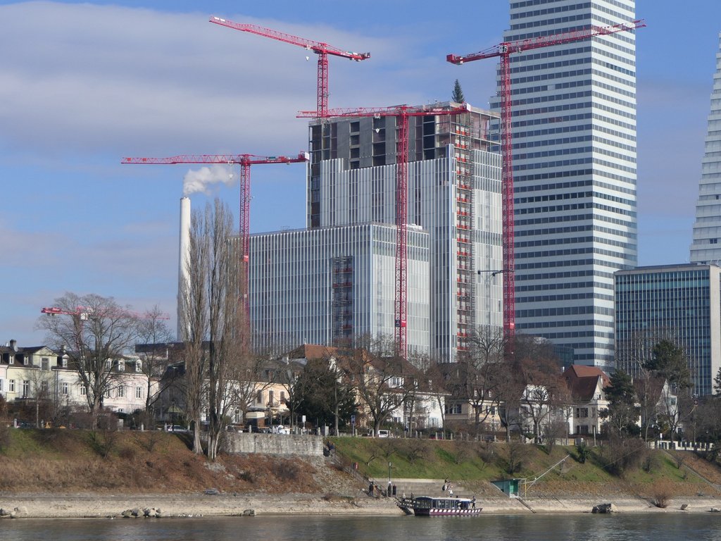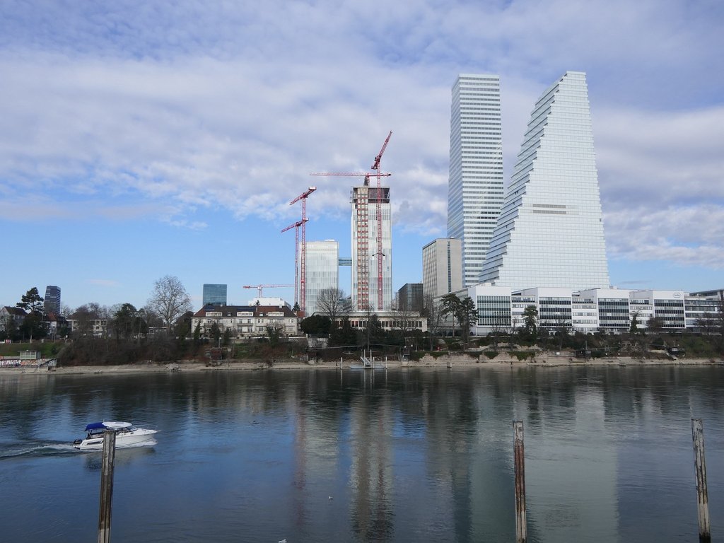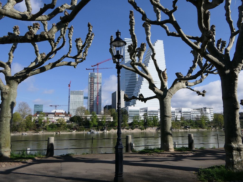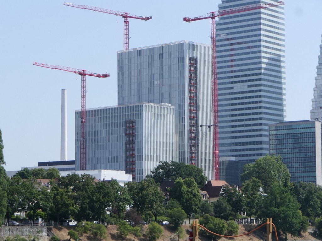 Übersicht mit allen nennenswerten (höheren) Türmen. Ganz rechts das Meret-Oppenheim-Hochhaus (81m) am Bahnhof SBB. Links davon der dunkle runde Turm der Bank für internationalen Zahlungsausgleich (70m) und hell daneben der Baloisepark (89m). Beide auf der anderen Seite des Bahnhofs am Centralbahnplatz. Etwa in der Mitte das 68m hohe Lonza-Hochhaus. Schon im linken Teil des Bildes, mittig über der Baumkrone im Vordergrund, der Claraturm (96m). Direkt dahinter versteckt sich der Grosspetertower (78m). Links davon dann der Messeturm (105m). Ganz links dann das Roche-Areal. 8 der (genannten) Hochhäuser auf dem Bild sind in den vergangenen Jahren entstanden!