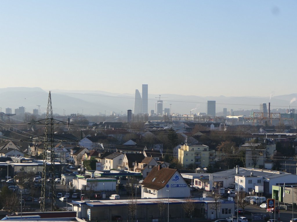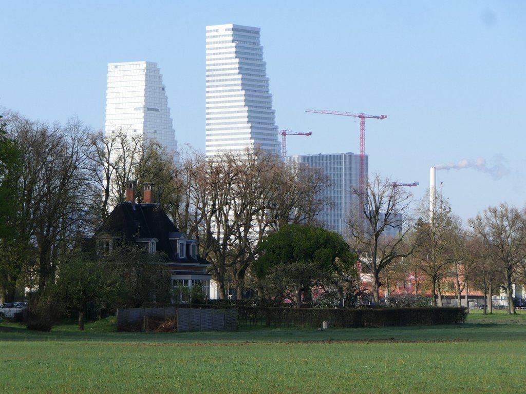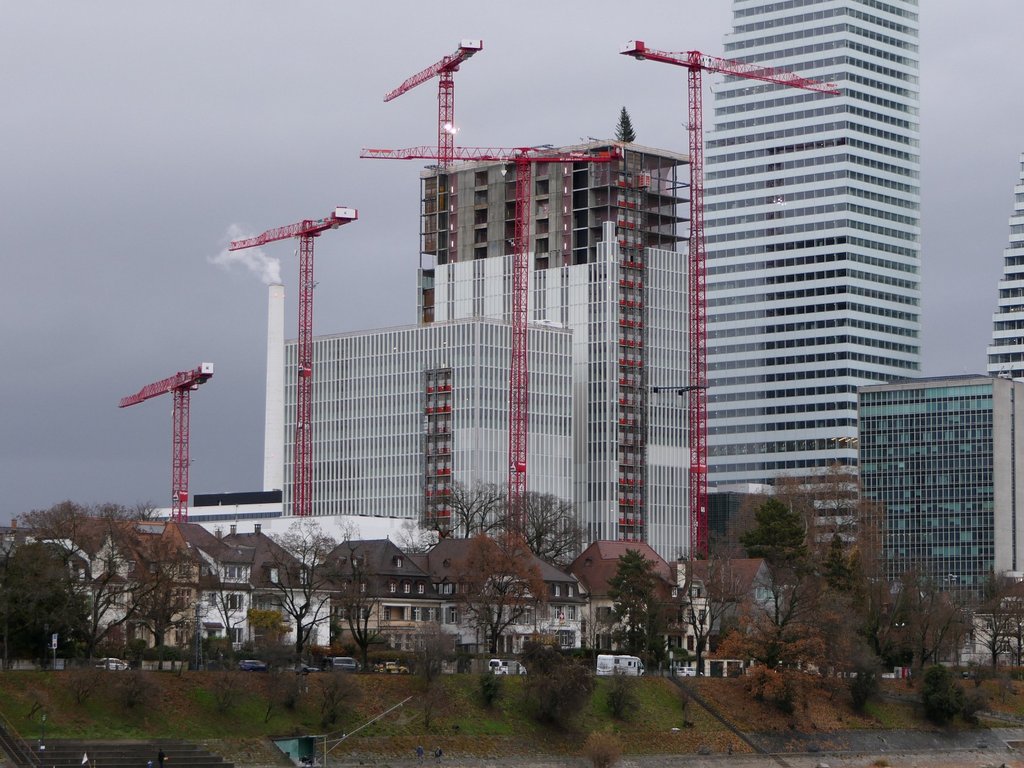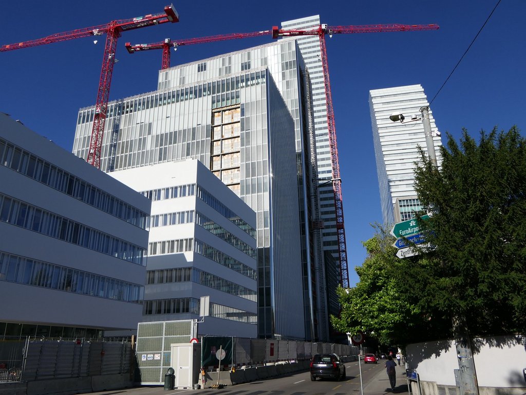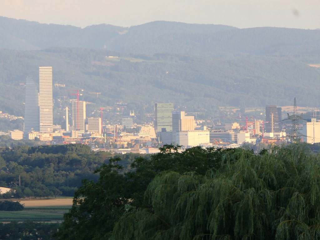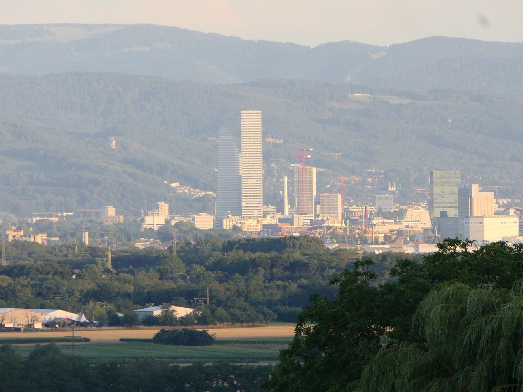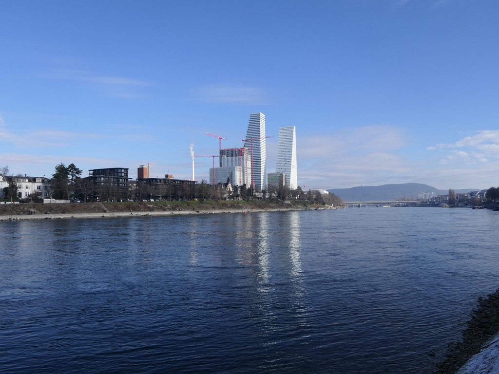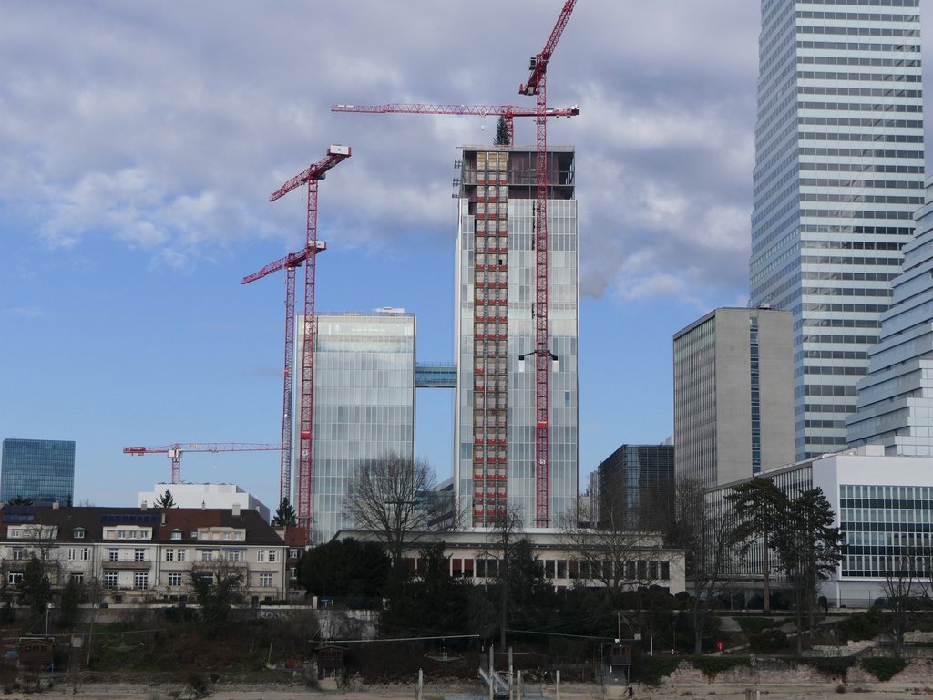 Übersicht mit allen nennenswerten (höheren) Türmen. Ganz rechts das Meret-Oppenheim-Hochhaus (81m) am Bahnhof SBB. Links davon der dunkle runde Turm der Bank für internationalen Zahlungsausgleich (70m) und hell daneben der Baloisepark (89m). Beide auf der anderen Seite des Bahnhofs am Centralbahnplatz. Etwa in der Mitte das 68m hohe Lonza-Hochhaus. Schon im linken Teil des Bildes, mittig über der Baumkrone im Vordergrund, der Claraturm (96m). Direkt dahinter versteckt sich der Grosspetertower (78m). Links davon dann der Messeturm (105m). Ganz links dann das Roche-Areal. 8 der (genannten) Hochhäuser auf dem Bild sind in den vergangenen Jahren entstanden!