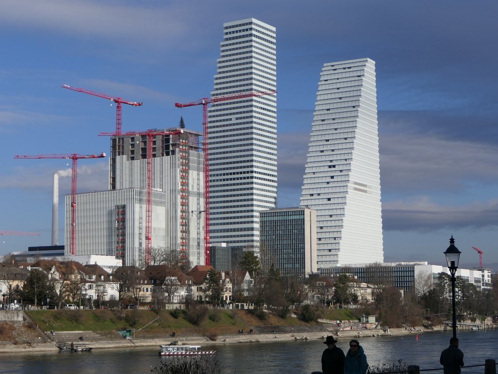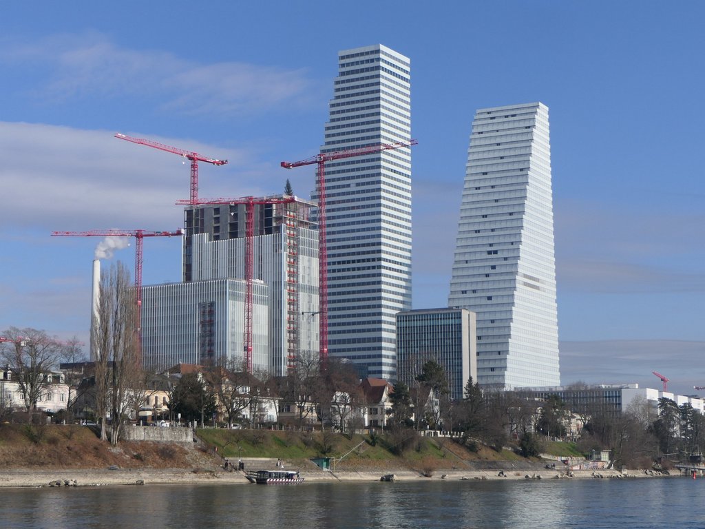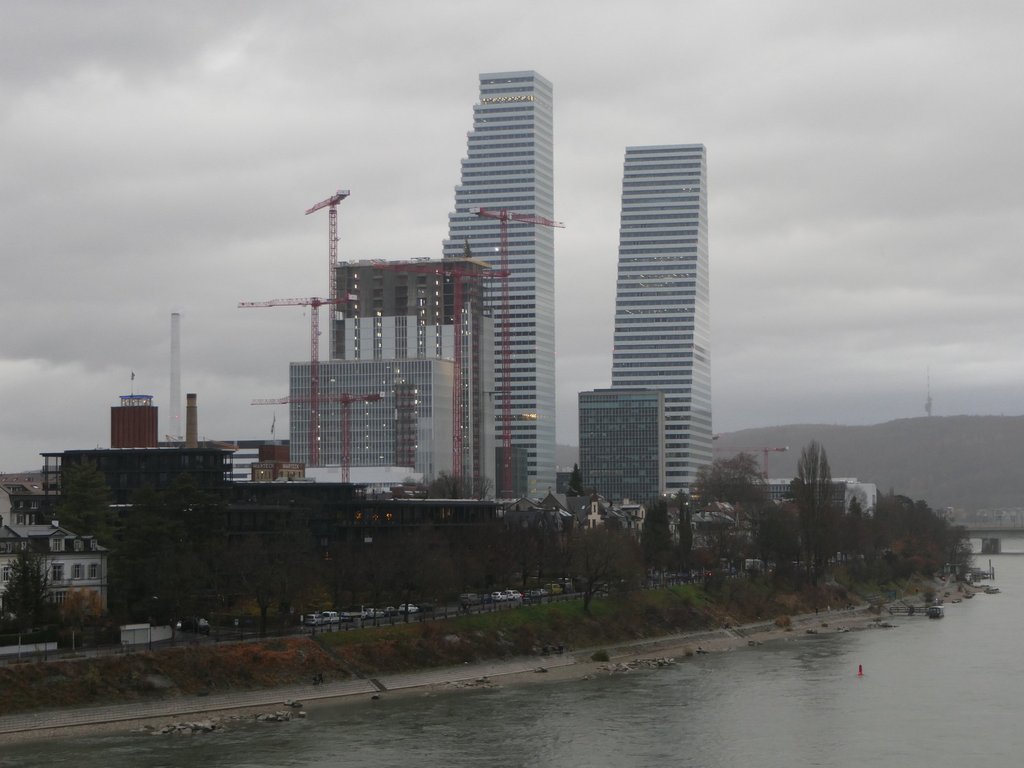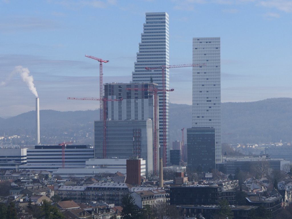 Roche-Areal links, Messeturm mittig und Claraturm (mit Grosspeter dahinter) rechts.