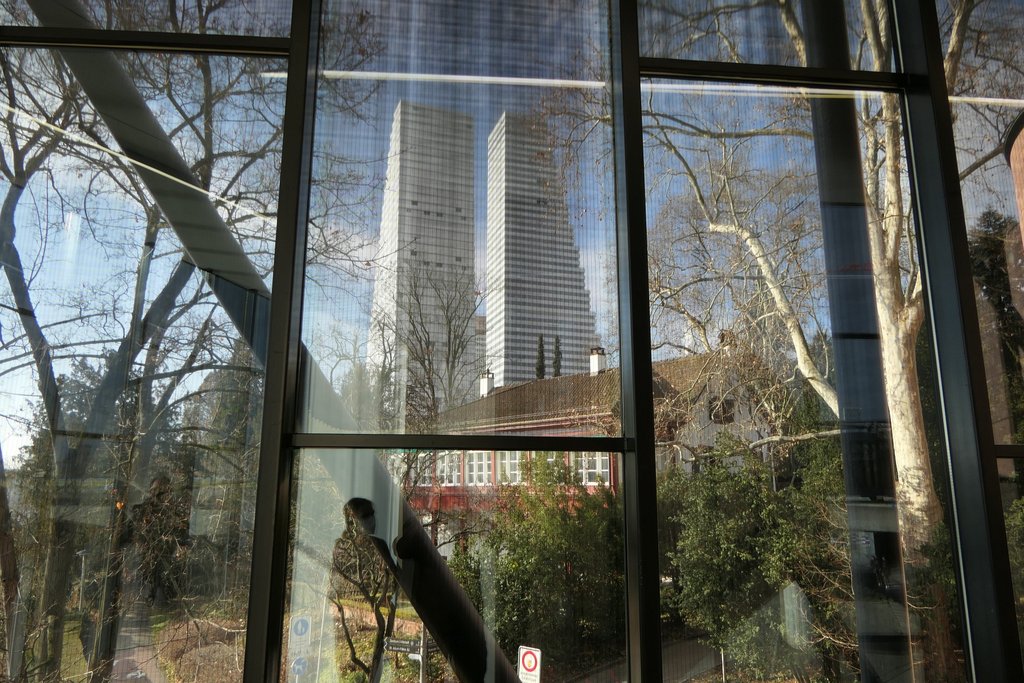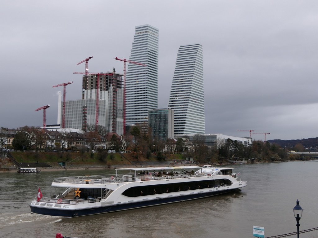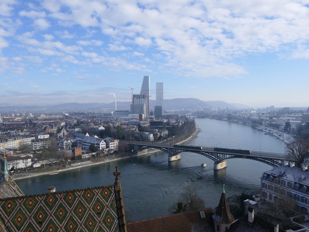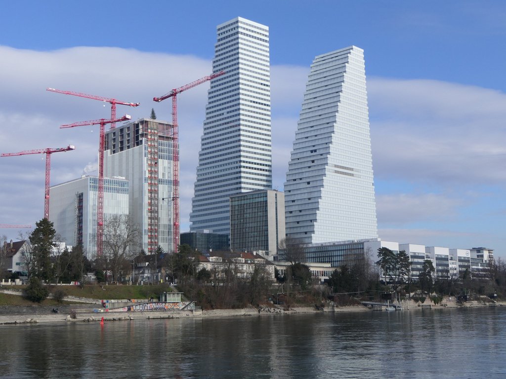 Roche-Areal links, Messeturm mittig und Claraturm (mit Grosspeter dahinter) rechts.