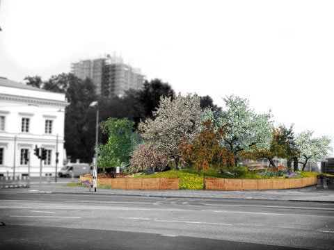 Der Rehberger-Entwurf ist gefällig und harmlos, tut keinem was. Er ist massenkompatibel, weil gegen ein hübsches Gärtchen, das sich dann auch noch Kunstswerk nennt, niemand was haben kann. Allerdings dürfte das im Herbst/Winter Mimikry-Kunst werden, sprich: fällt nicht groß auf (oder sollen das bunte Kunstbäume und -rasen sein?).