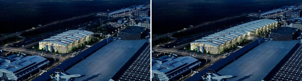 Das Bestandsgebäude verläuft entlang des roten Pfeils. Der Eingang befindet sich am Pfeilanfang. Mit dem 2. BA kämen demnach 18 "Riegel" mit jeweils zwei Flügeln hinzu. Momentan sind 10 Riegel gebaut, wenn ich richtig gezählt habe. In der Mitte ist der zukünftig noch großzügigere Eingangsbereich zu erkennen. Es steht sogar ein Flugzeug in einer Lobby, die sich über zwei Flügel erstreckt. Etwas näher (Süden oben):