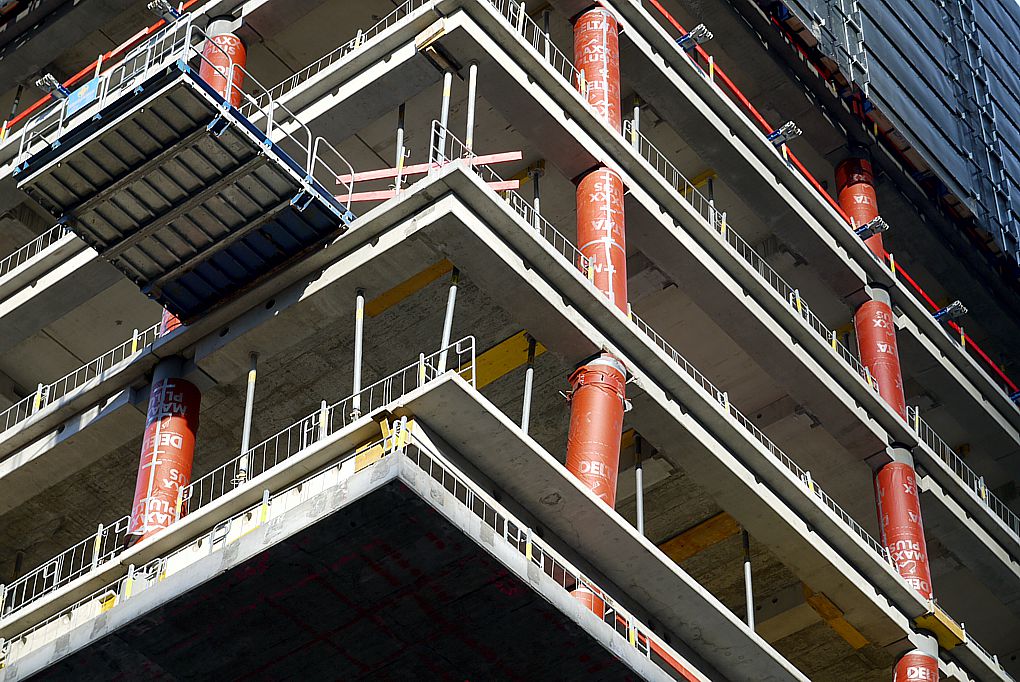 Heute werden schon die ersten Deckenzüge angeliefert, an denen ein schräger Anker für eine schräge Stütze eingegossen ist. Es geht also los mit dem Hüftschwung. Grad ist Etage 14 in Arbeit.