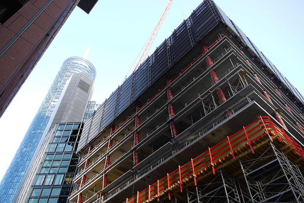 Einmal Vorder und Rückseite in der frontalen, sowie nach oben blickend von der Kreuzung Neue Mainzer Straße / Große Gallusstraße. Jetzt schon ein genialer Blick an Europas erster Kreuzung mit 4. Hochhäusern.