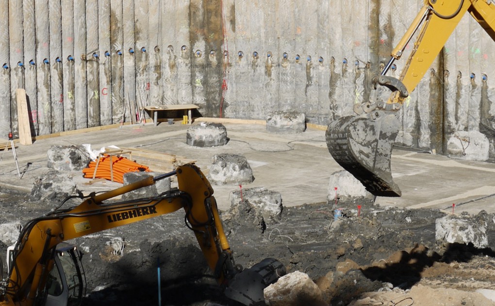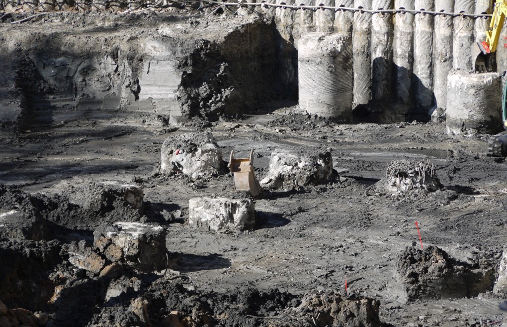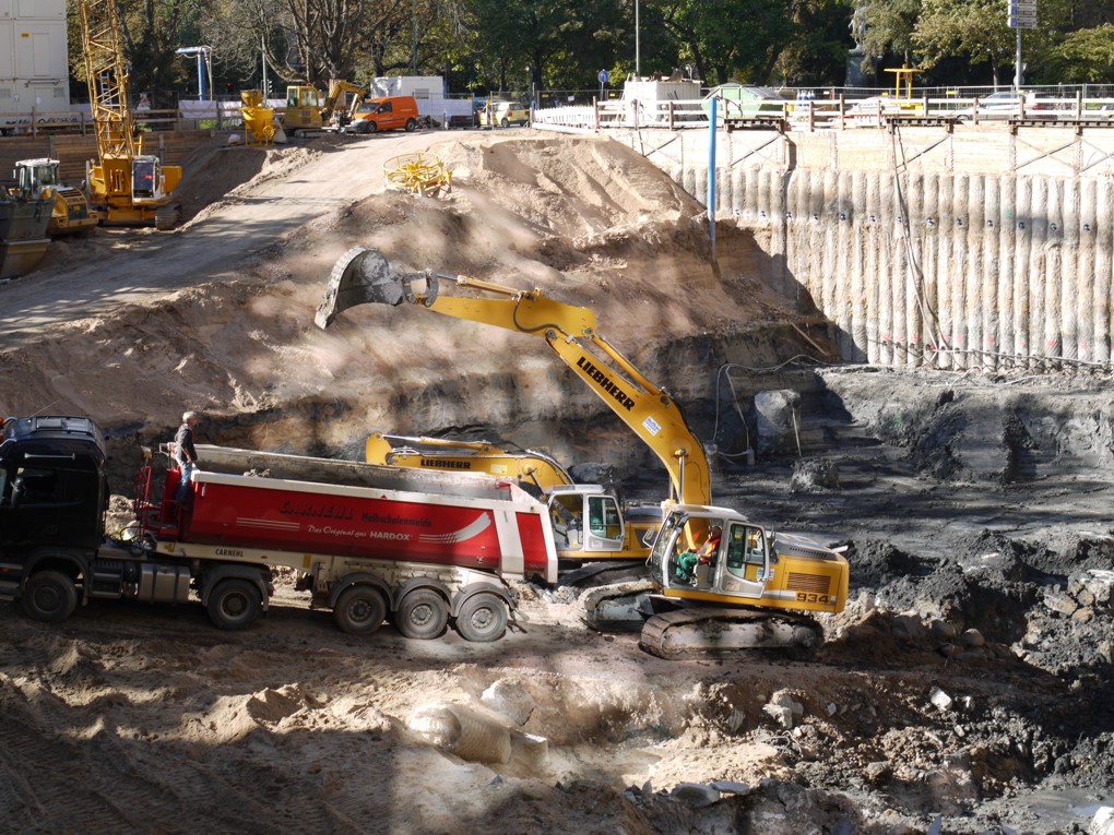 Die Endtiefe ist meiner Meinung nach schon erreicht, svenb. Aus der Sauberkeitsschicht ragen die Köpfe der Bohrpfähle, die später noch von Beton befreit werden. Die Pfähle würden zu weit in die Bodenplatte hineinragen, würde noch tiefer ausgehoben.