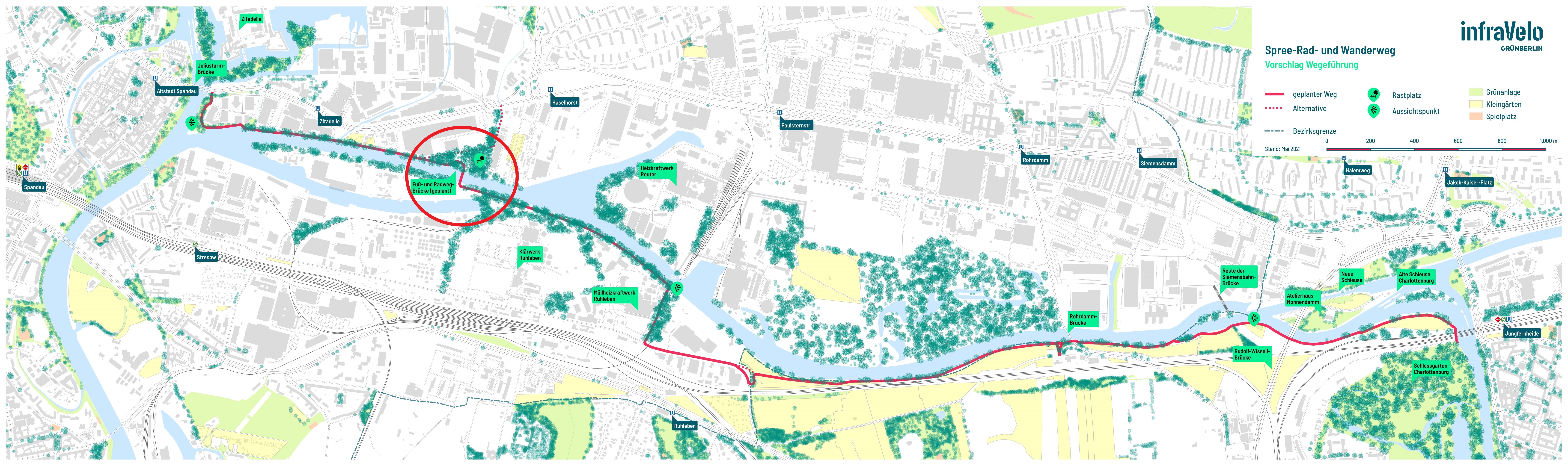 Leider fehlen wenige 100 m zwischen dem Telegrafenweg und den Grünanlagen um die Zitadelle, hier muss man einen lästigen und erheblichen Umweg über die Daumstraße und die nicht gerade idyllische Straße Am Juliusturm machen, so dass man hier besser die zwei Stationen (Haselhorst bis Altstadt Spandau) mit der U-Bahn fährt. Hier ist kurz- bis mittelfristig auch keine Lösung in Sicht.