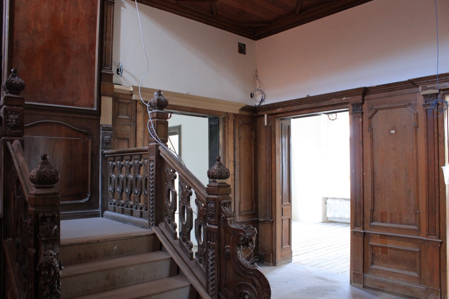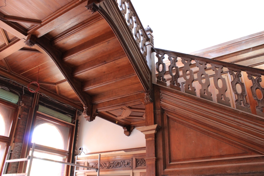 Im Innern zeigt sich das Prunkstück schon weitgehend in fertigem Raumeindruck: Das Treppenhaus aus wertvollen Nuss- und Eichenhölzern wird originalgetreu wiederhergestellt.