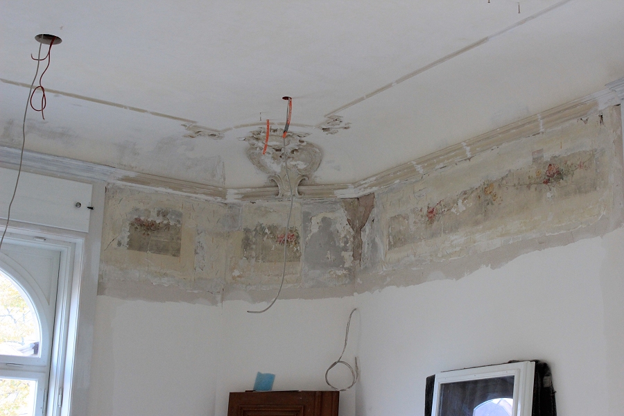 Farbfassungen werden freigelegt, dokumentiert und anschließend wieder weiss gestrichen. Dazu kommt eine Lage Japanpapier drauf, das sich später mal wiede rleicht lösen lässt.