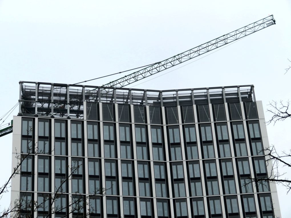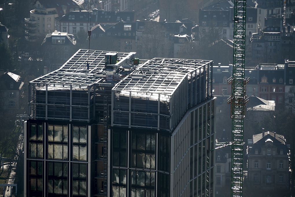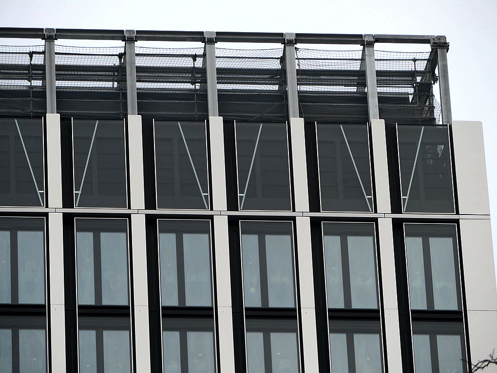 Und endlich geht es mit täglichem Fortschritt voran. Die vorletzte Reihe der Abschlussfassade ist zur Hälfte montiert, die Ostseite ist komplett. Die Elemente haben außen eine Glasscheibe (wie an den Fassadenelementen darunter), innen eine Lamellenkonstruktion für die Luftzirkulation: