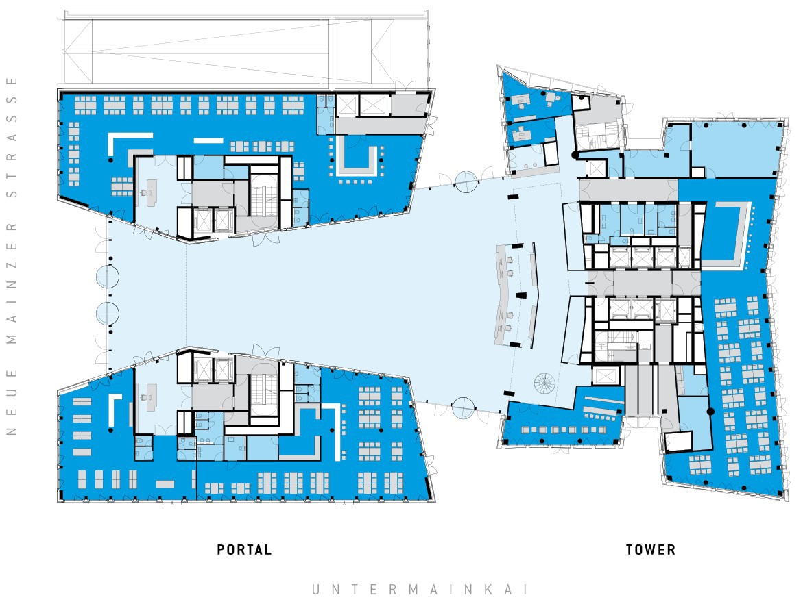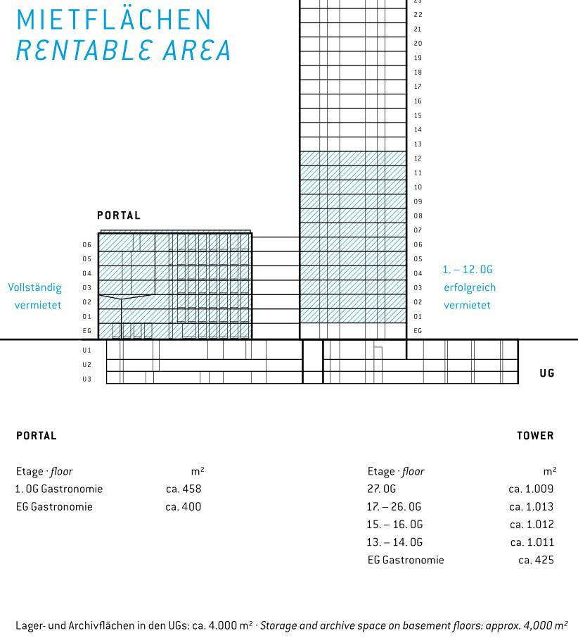 In das Erdgeschoss des Turms, an die Ostseite zum Platz, zieht ein "Spitzenrestaurant". Vapiano bezieht das Portalgebäude. Dort gibt es zweigeschossige Gastronomieflächen, und über zwei Etagen soll das Restaurant nun doch reichen (Q). Insgesamt 858 m², der Rest könnte Nebenfläche im Untergeschoss sein.