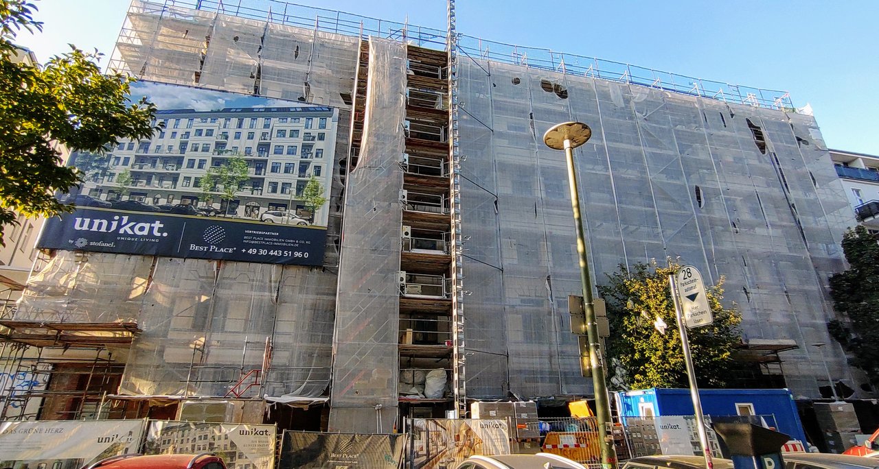 Gegenüber wird das Gebäude schon seit ziemlich langer Zeit renoviert. Man kann auch nicht erkennen, ob das demnächst fertig wird.