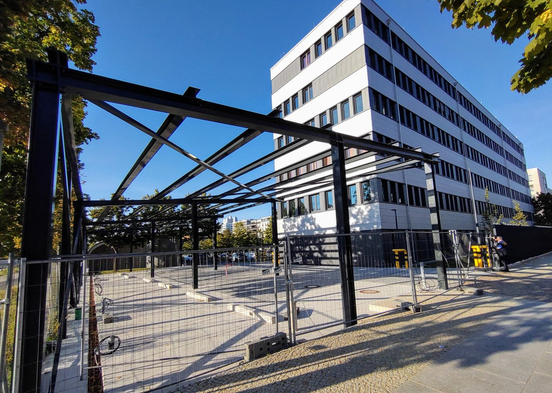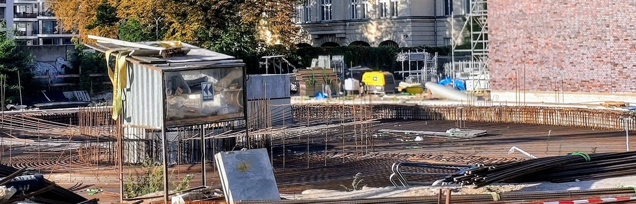 Hier ist der Rohbau Fast abgeschlossen : Berliner Wasserbetriebe mit den nebenan bestehende Gebäude was längst fertig gebaut wurde seit über 10 Jahren.