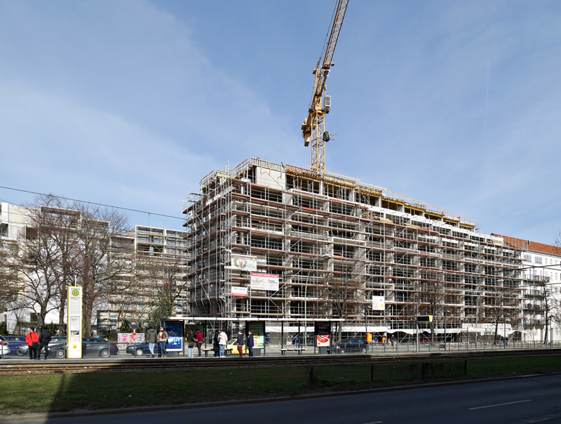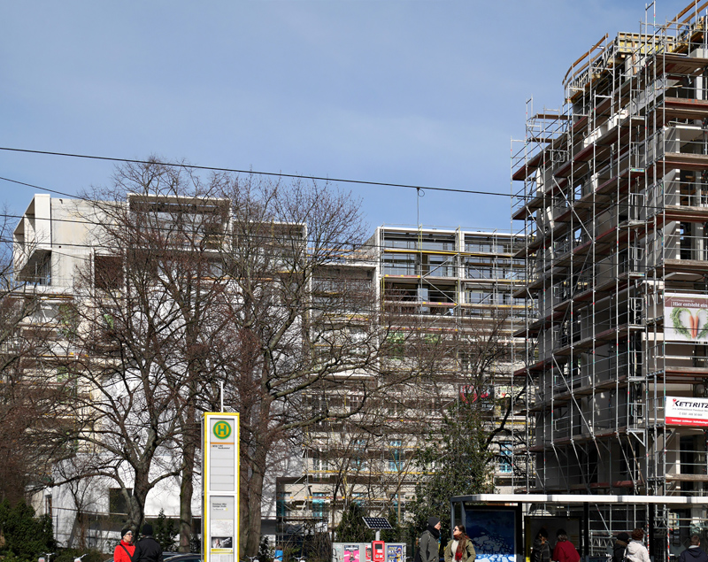 Inzwischen sind die Gerüste fast abgebaut. Das Neue sieht schon deutlich interessanter als die Nachbargebäude aus der Nazizeit aus.