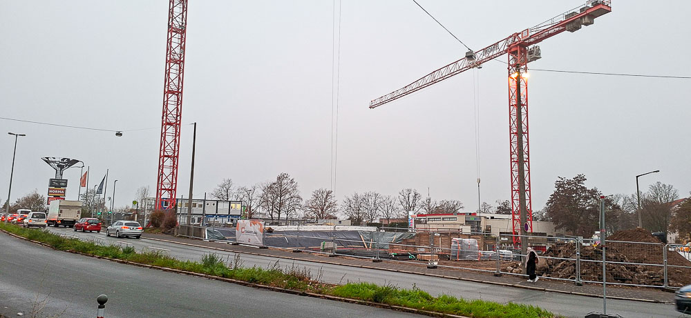 Anstelle einer Tankstelle ist nun eine große Baugrube entstanden mit zwei sehr hohen Kränen.