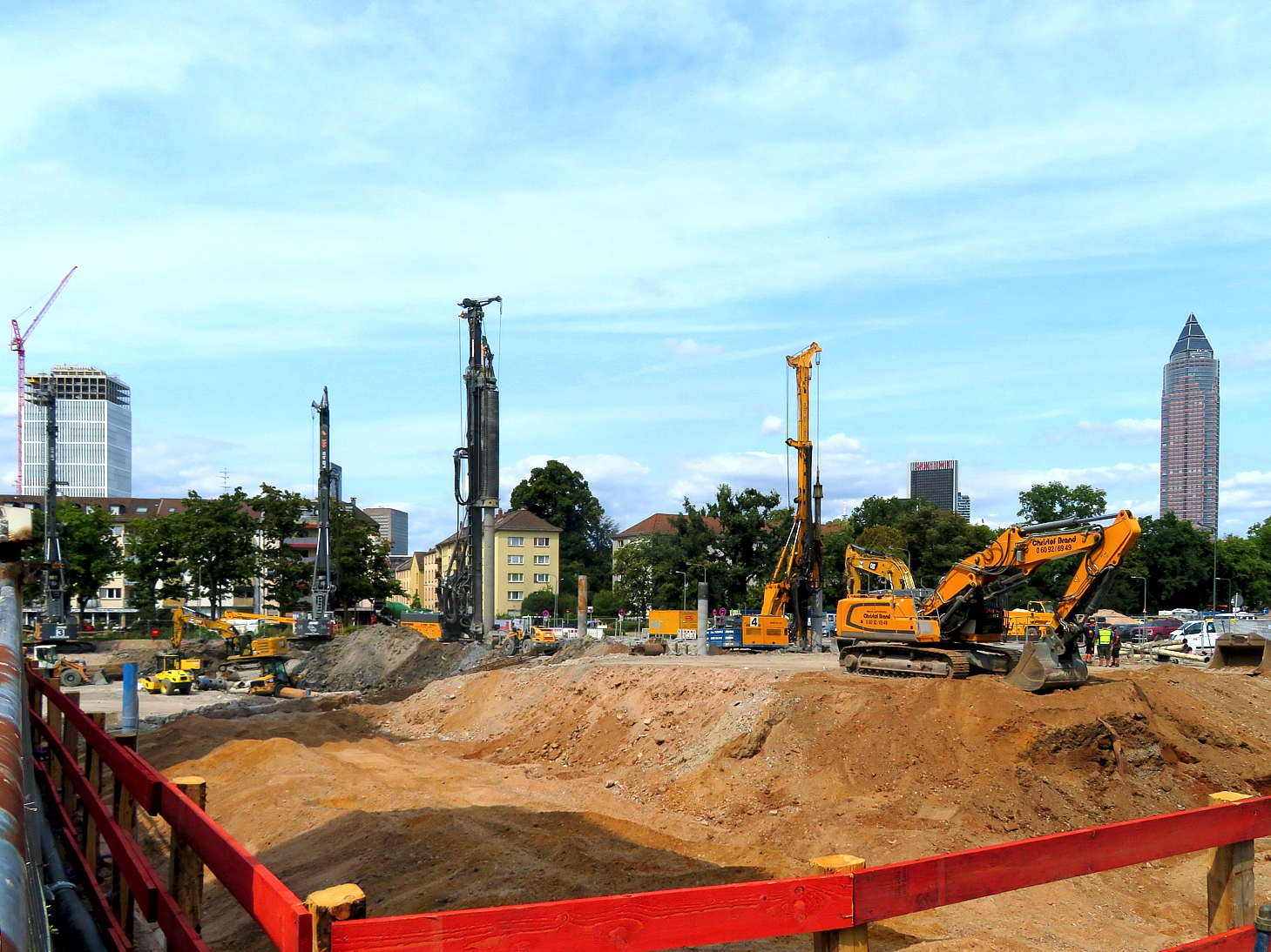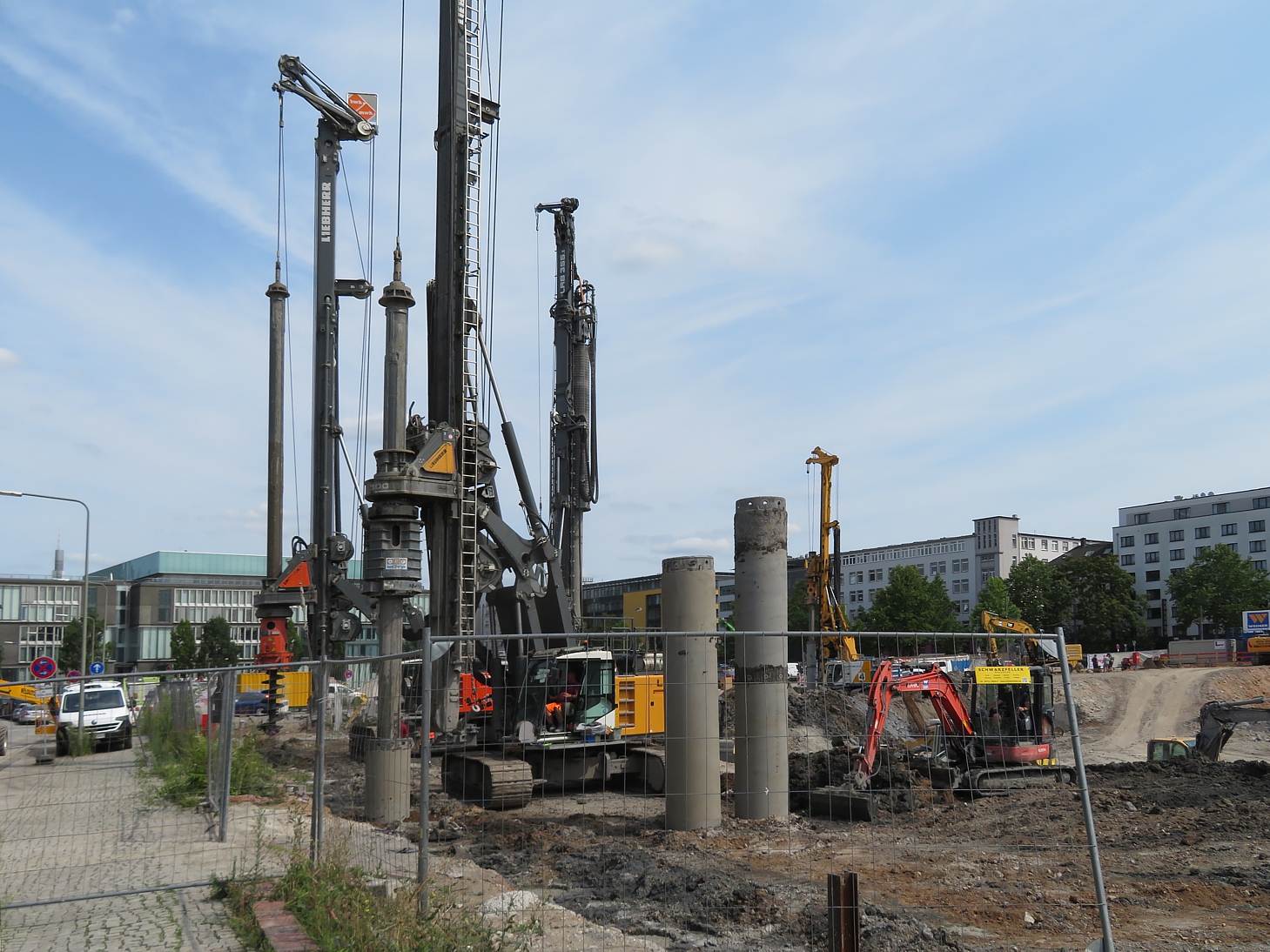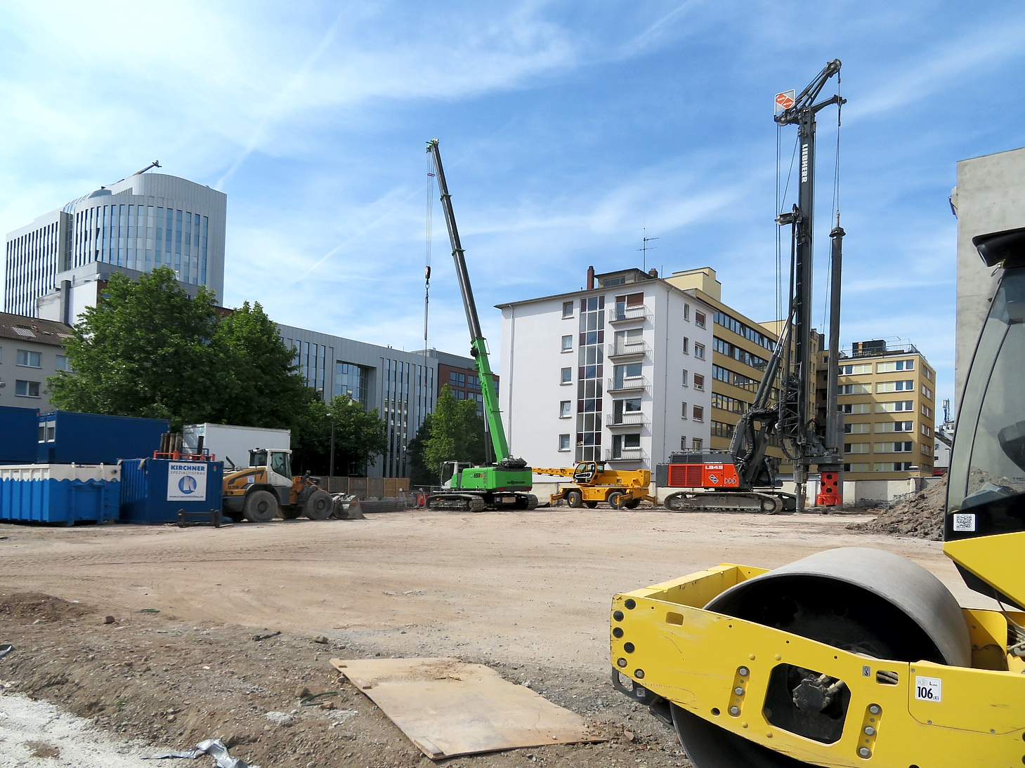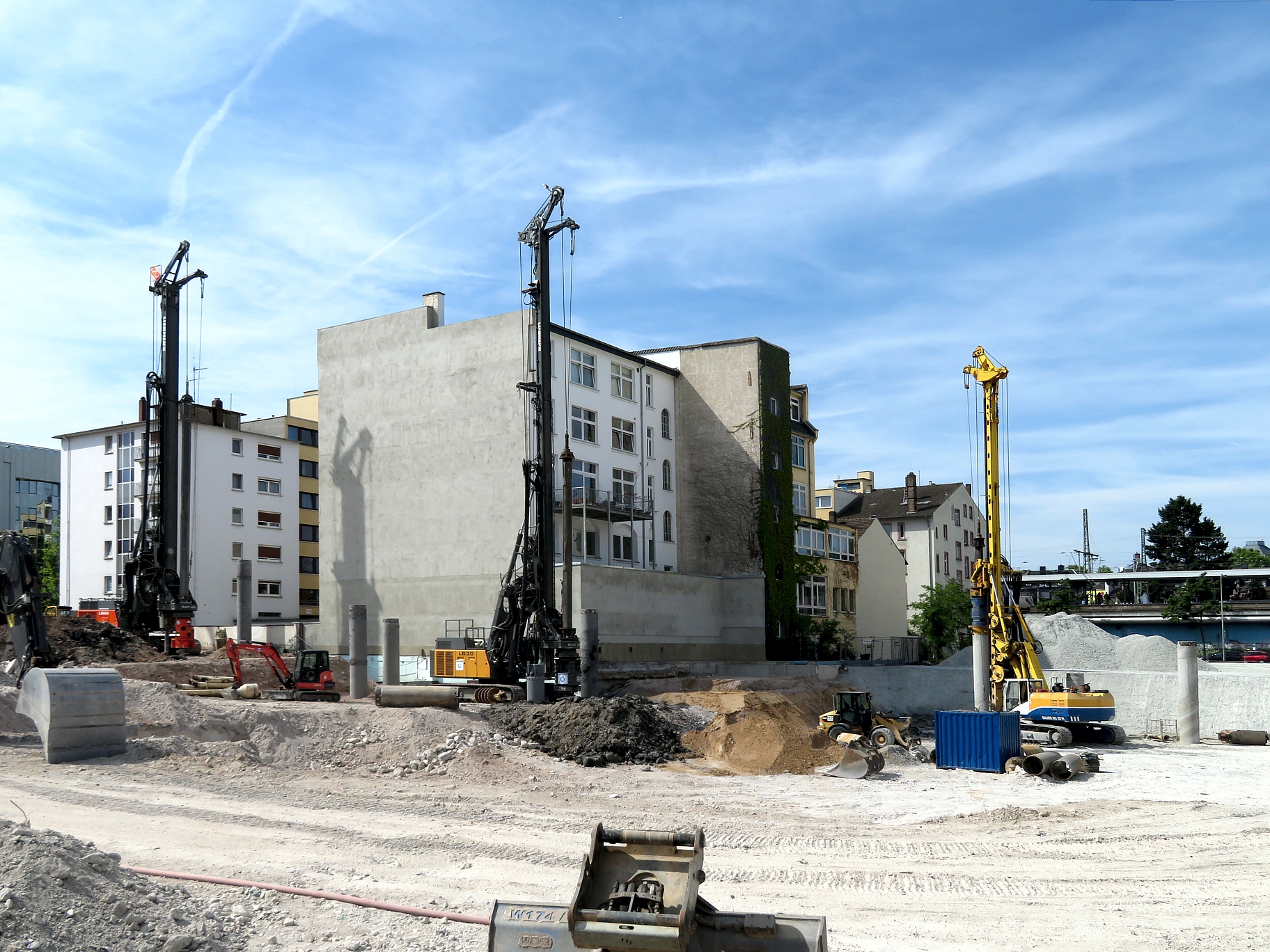 An der Ecke Günderodestraße Frankenallee arbeitet gerade die Firma Implenia mit einem Liebherr LB 30 Drehbohrgerät. Hier stand ein Gebäude, das bis in die 80er Jahre auch als Tankstelle genutzt wurde #40. So ließ sich im Rahmen des Abrisses hier ein umfangreicher Erdaustausch beobachten. Aufgabe der Firma Implenia ist jetzt die Sanierung eines noch verbliebene, lokal begrenzten Schadstoffareals durch Aushub und Neuverfüllung. Das Gelände wird nach dem Rückbau Altlastenfrei der Stadt Frankfurt für den dort vorgesehenen Schulbau übergeben.