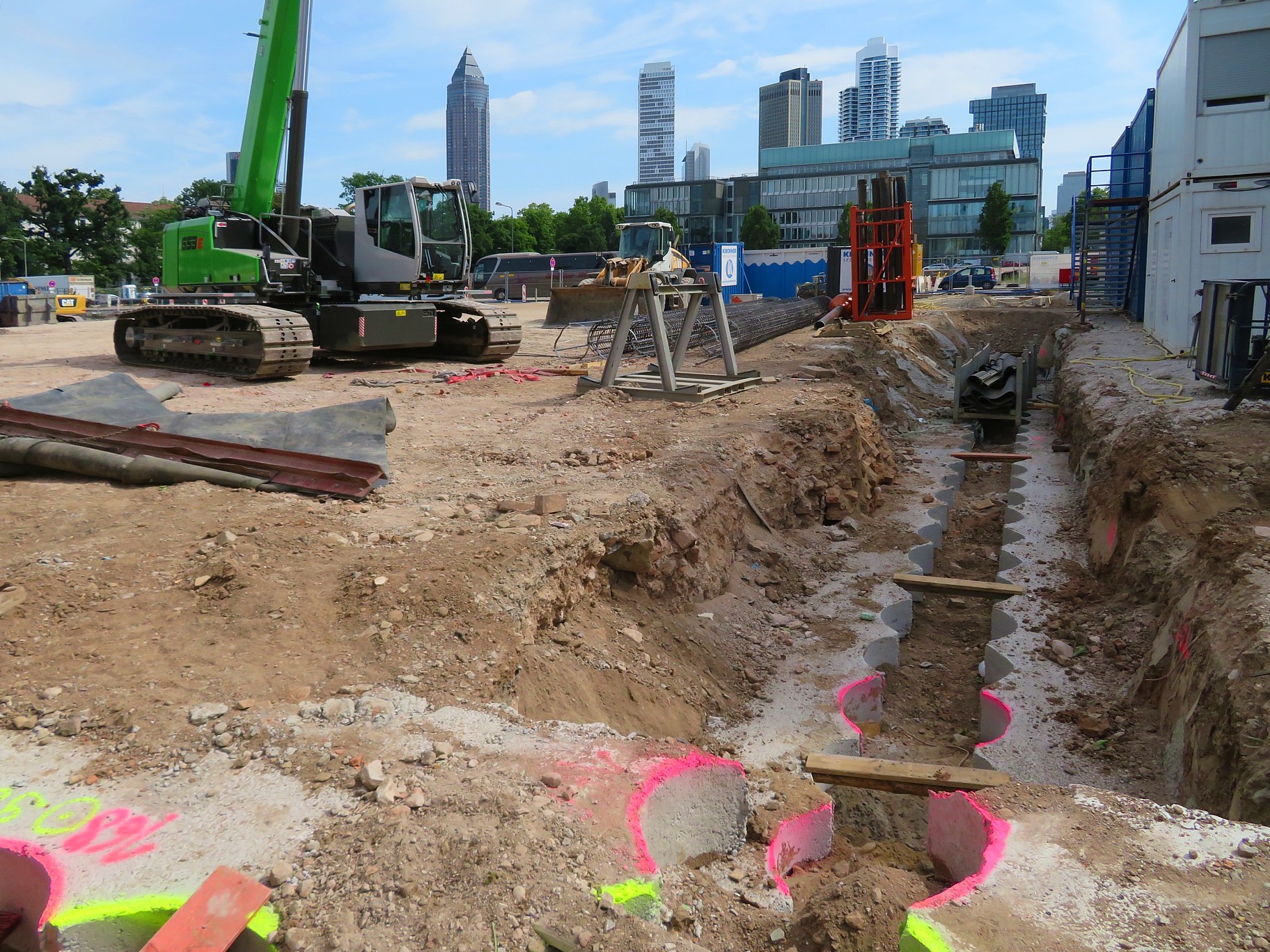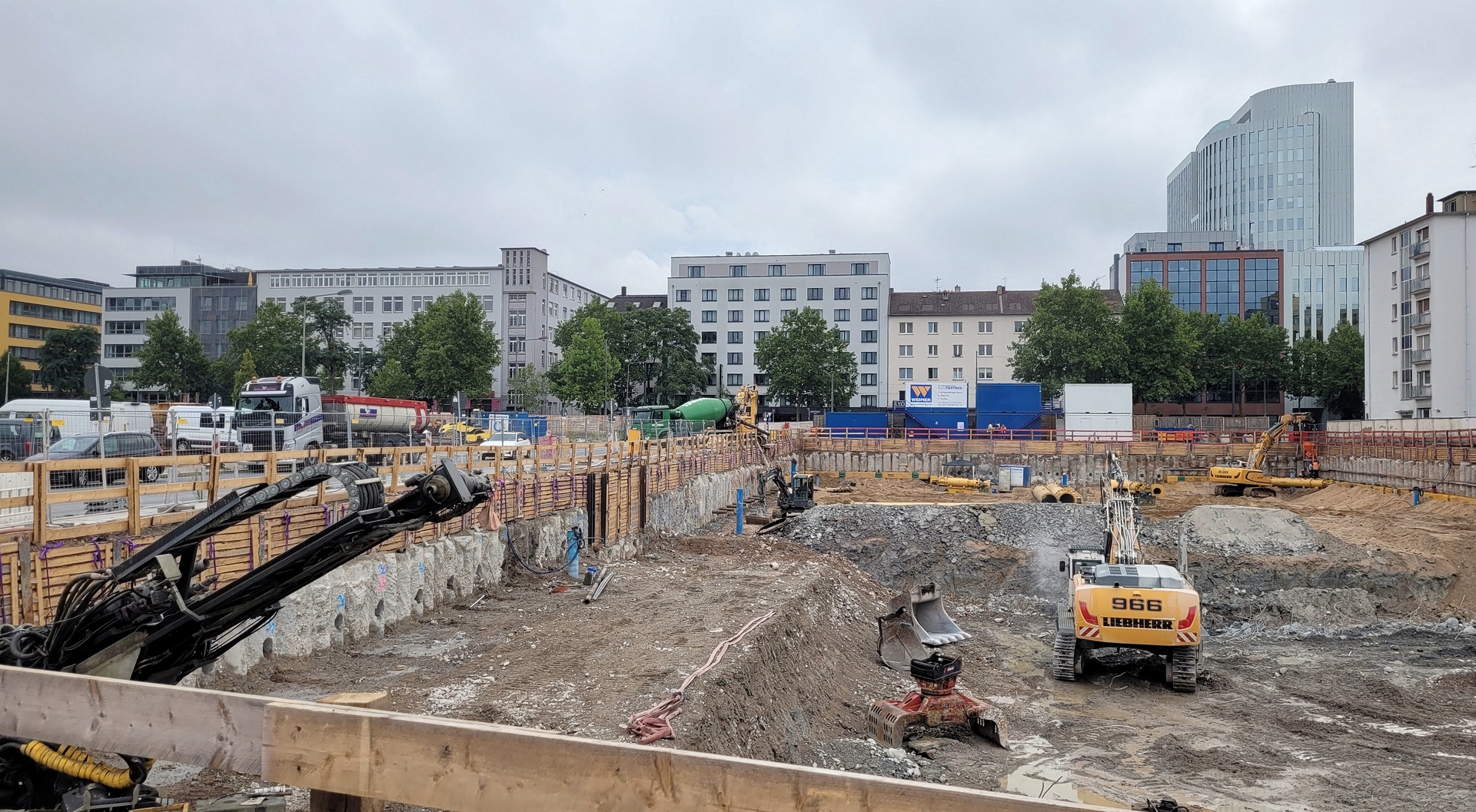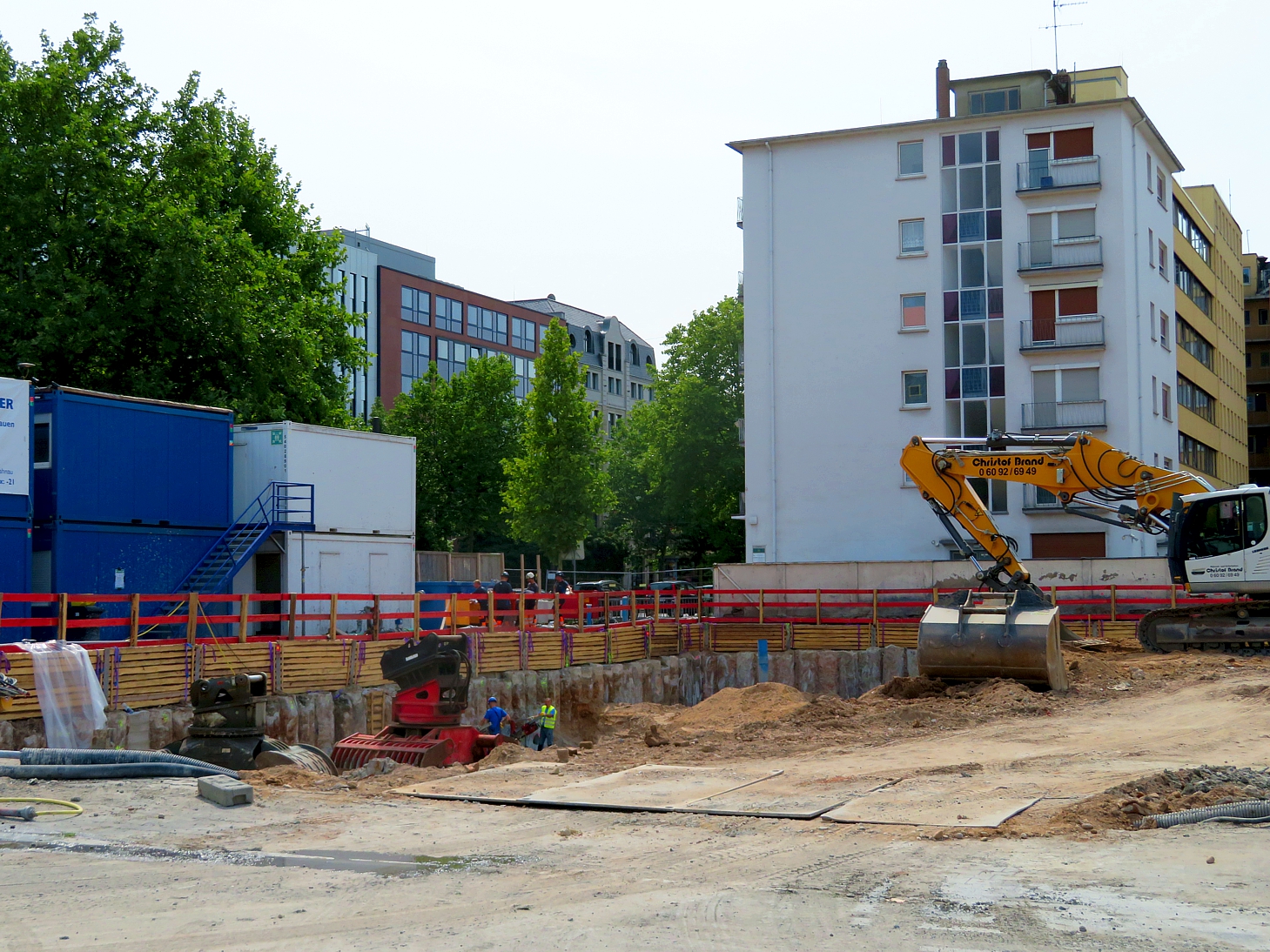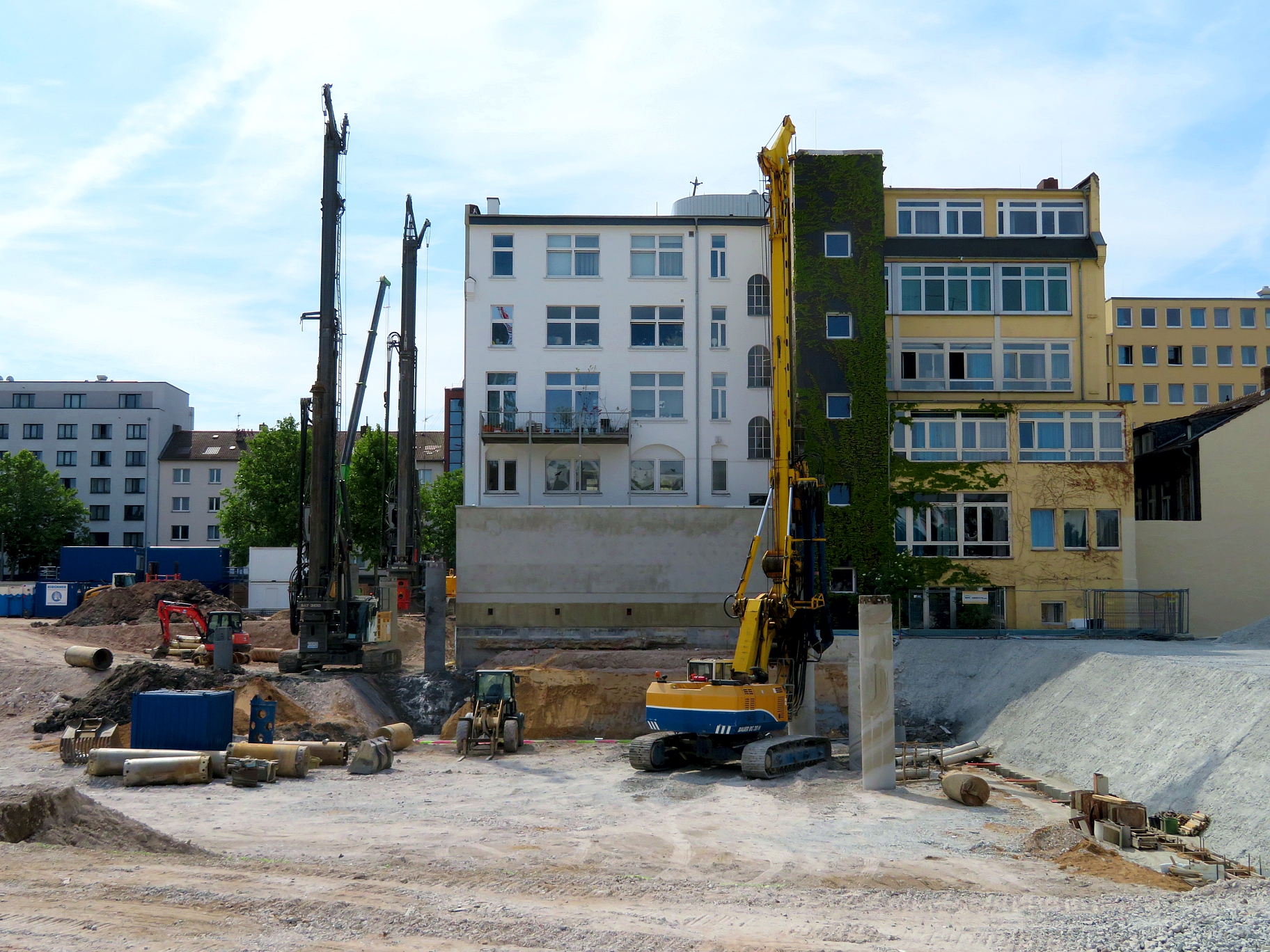 An der Ecke Günderodestraße Frankenallee arbeitet gerade die Firma Implenia mit einem Liebherr LB 30 Drehbohrgerät. Hier stand ein Gebäude, das bis in die 80er Jahre auch als Tankstelle genutzt wurde #40. So ließ sich im Rahmen des Abrisses hier ein umfangreicher Erdaustausch beobachten. Aufgabe der Firma Implenia ist jetzt die Sanierung eines noch verbliebene, lokal begrenzten Schadstoffareals durch Aushub und Neuverfüllung. Das Gelände wird nach dem Rückbau Altlastenfrei der Stadt Frankfurt für den dort vorgesehenen Schulbau übergeben.