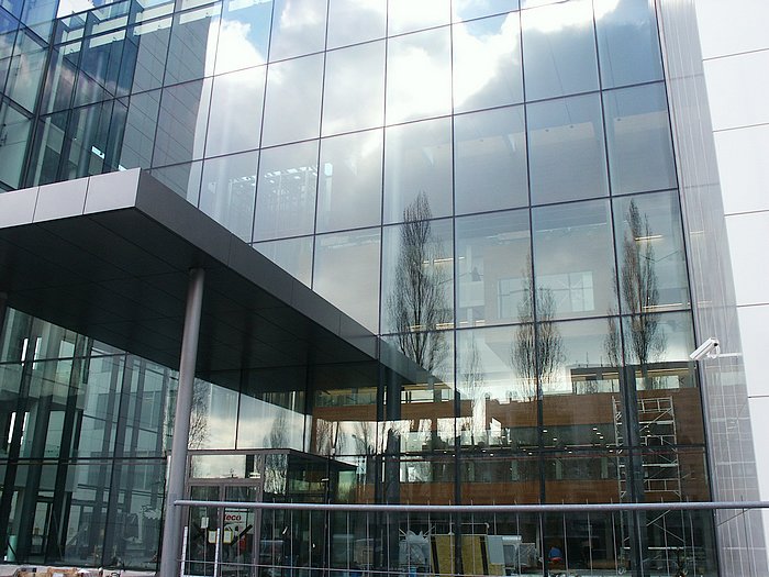 Die Architektrur von aussen ist schon sehr schlicht. Habe aber das Gebäude von innen gesehen, das ist schon ziemlich cool. Einzelne Stockwerke ragen seitlich in die Empfangshalle, also freihängend. Ich weiss garnicht, wie ich es beschreiben soll. Sieht sehr interessant aus.