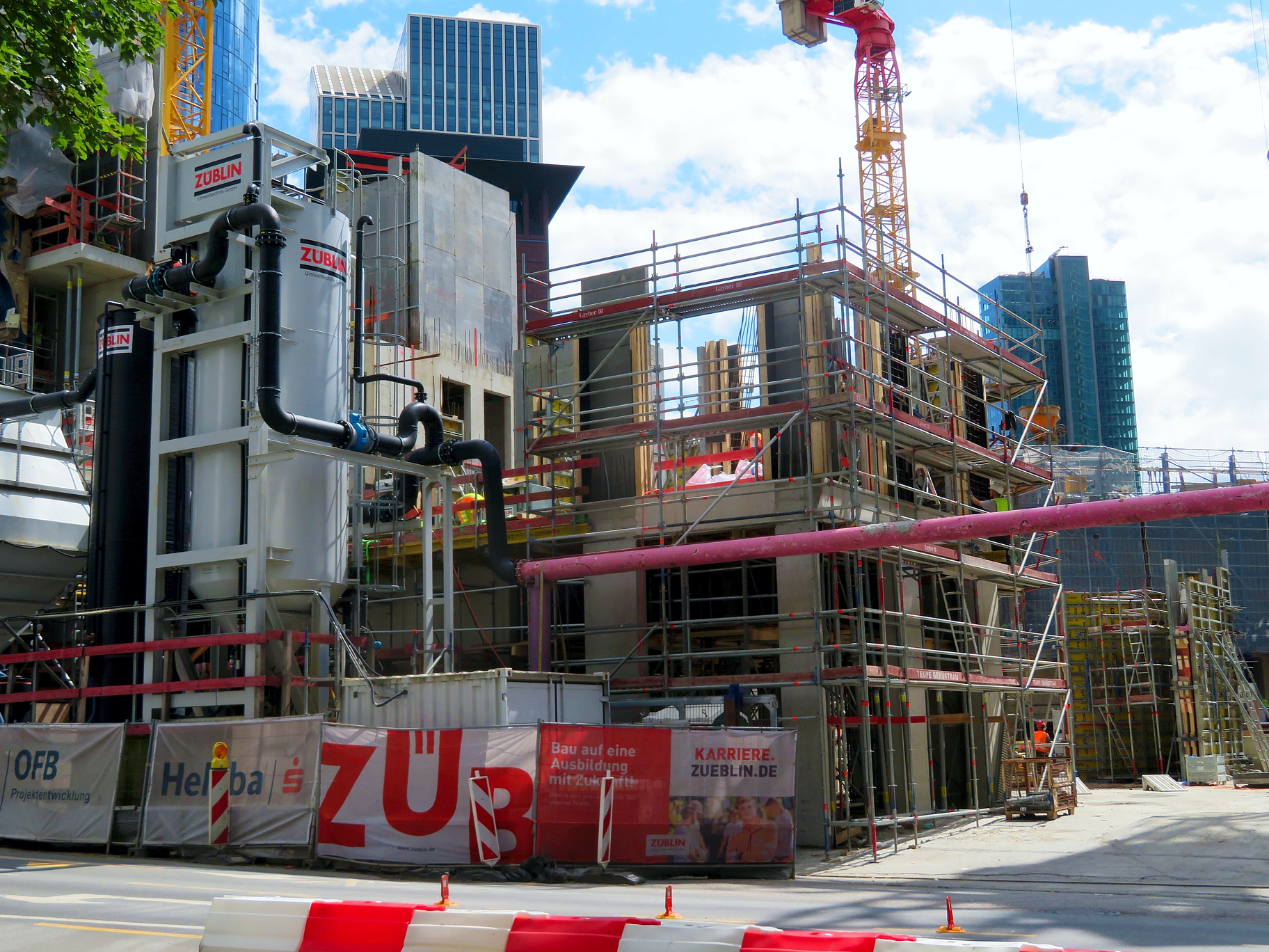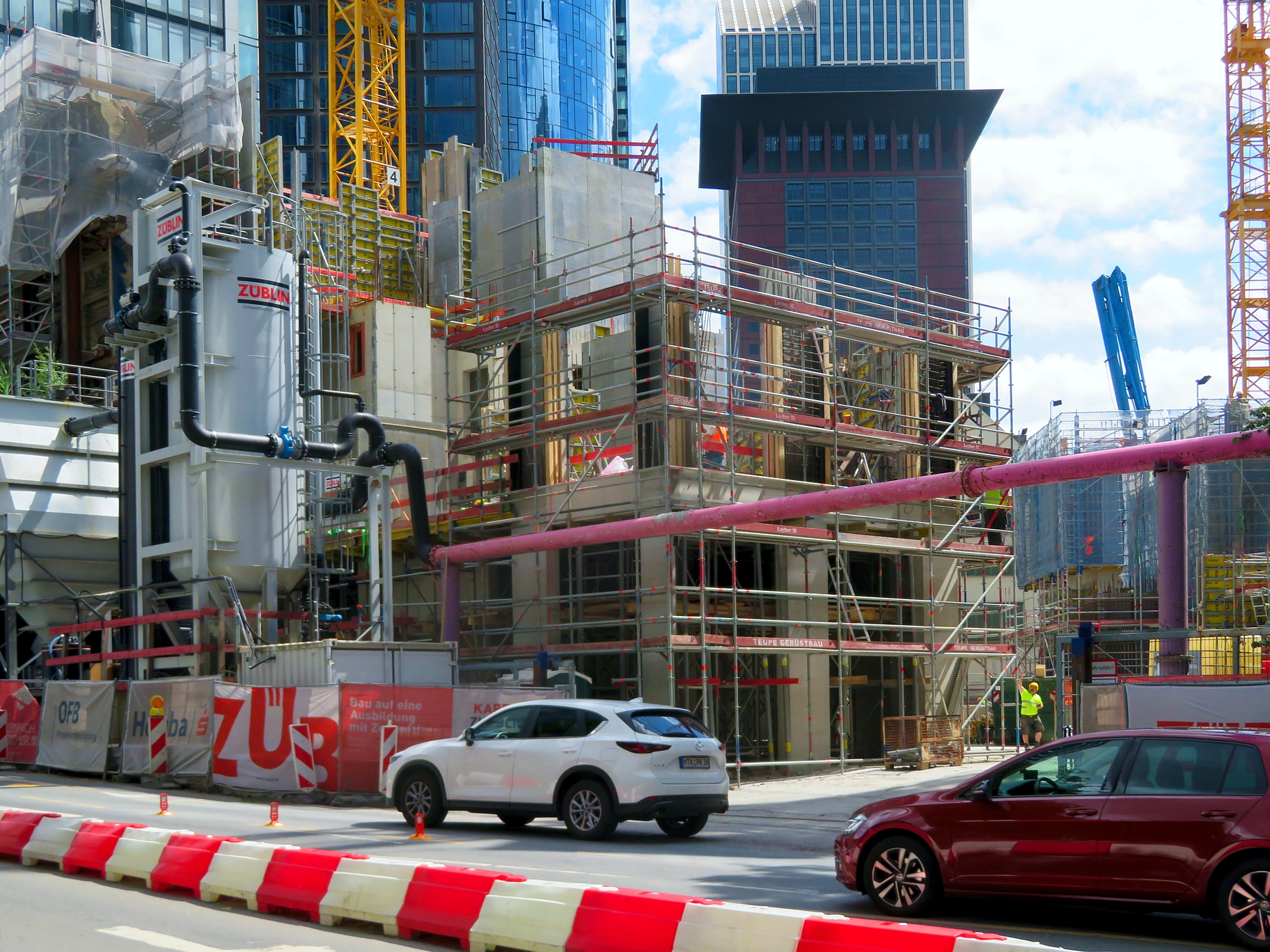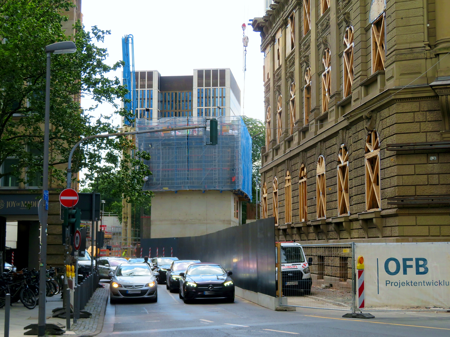 Der Stand beim Bau des Hochhauses – von der Kreuzung Junghofstraße und Neue Mainzer Straße: