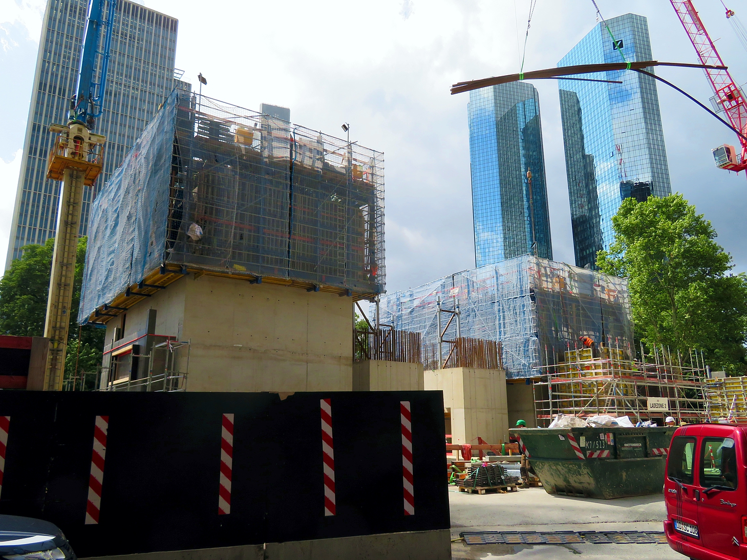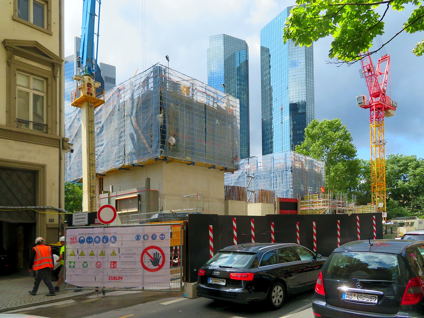 Mittlerweile sind einige Hochhausbestandteile so weit in die Höhe gewachsen, dass die Arbeiten auch von der Taunusanlage aus beobachtet werden können. Der hohe, dunkle Bauzaun verhindert nunmehr nicht mehr jeden Einblick.