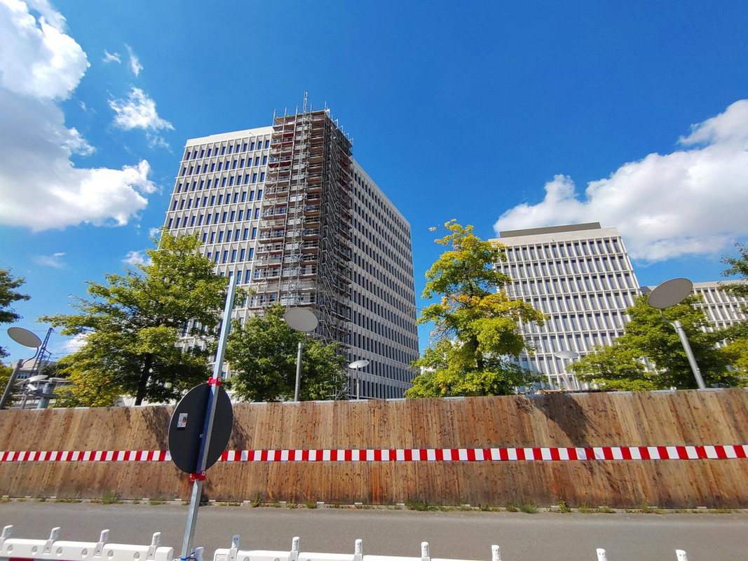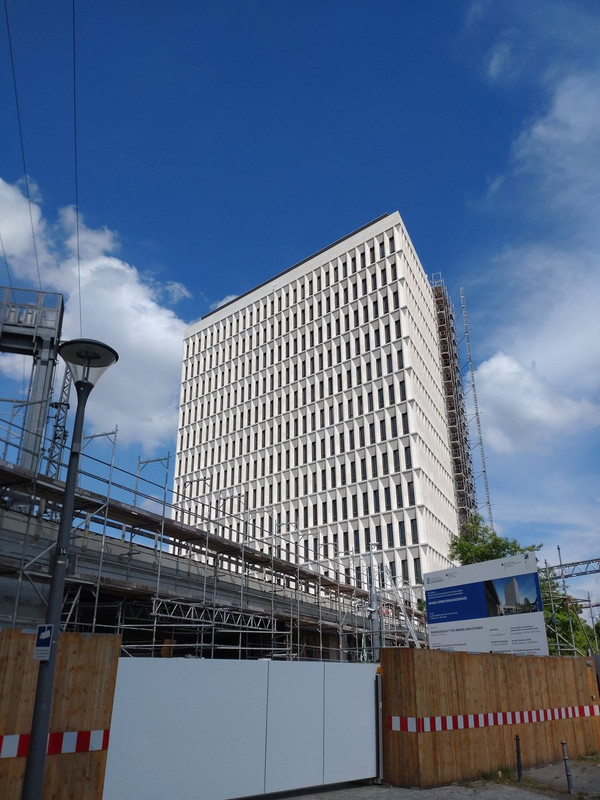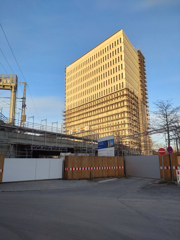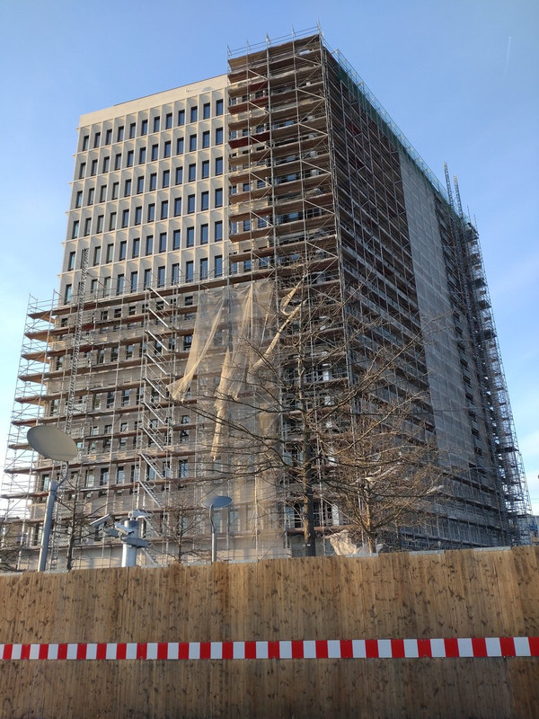 Die Arbeiten ziehen sich dahin. Nach wie vor sind die Gerüste im EG Bereich noch da. Der Eingangsbereich sieht allerdings recht cool aus, vor allem die Lichtaugen im Durchgang gefallen mir.