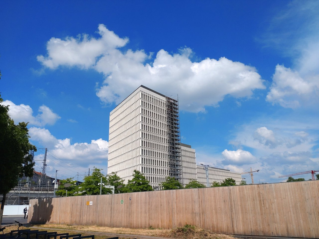 Hier ein Bild ( Google Street) als es noch in Bau war. Hier.( Lücke - Abstand) .Gut auch bei Google Earth auch zu sehen. Das Objekt ist auch streng bewacht und gut umzäunt. Groß ist der Abstand nicht beim hohren Gebäude mit der Bahntrasse.