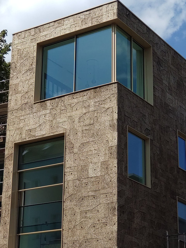 Ich finde die Fassade irgendwie interessant und fast schon rätselhaft. Erinnert mich an Kork, bzw. eine Dämmung mit einem ungewöhnlichen Muster - da stimme ich @Theseus532 absolut zu. Die schwarzen Punkte/Löcher tauchen in der Visu nicht auf, auch ist die Fassade dort wesentlich heller und das Muster/die Strukturierung etwas anders.