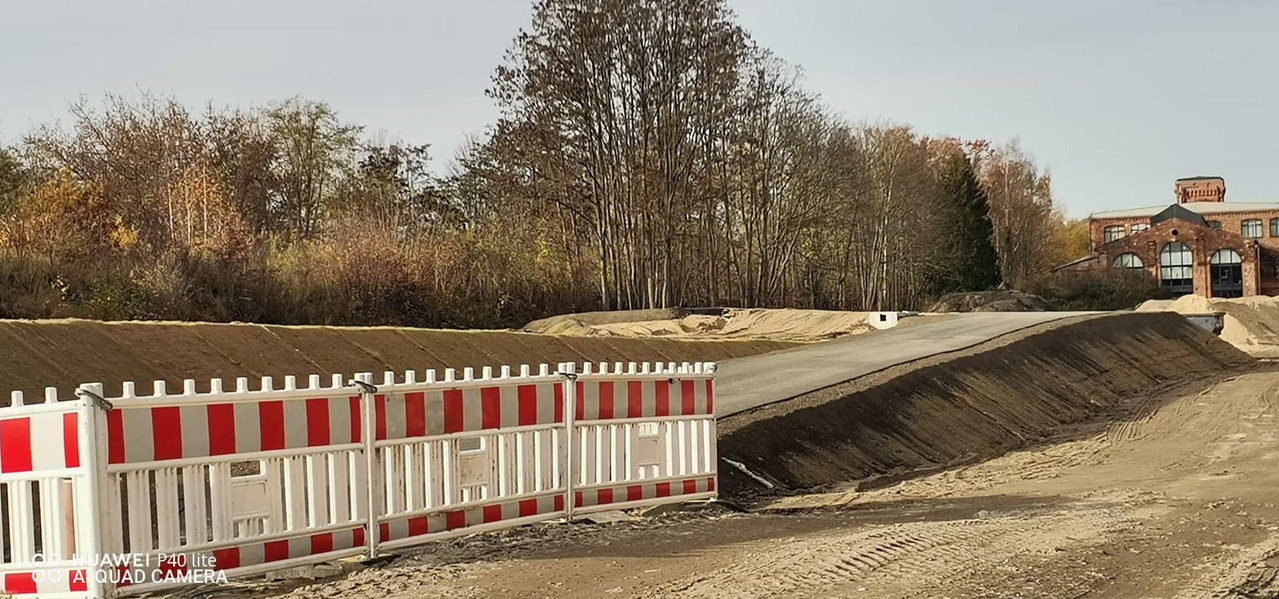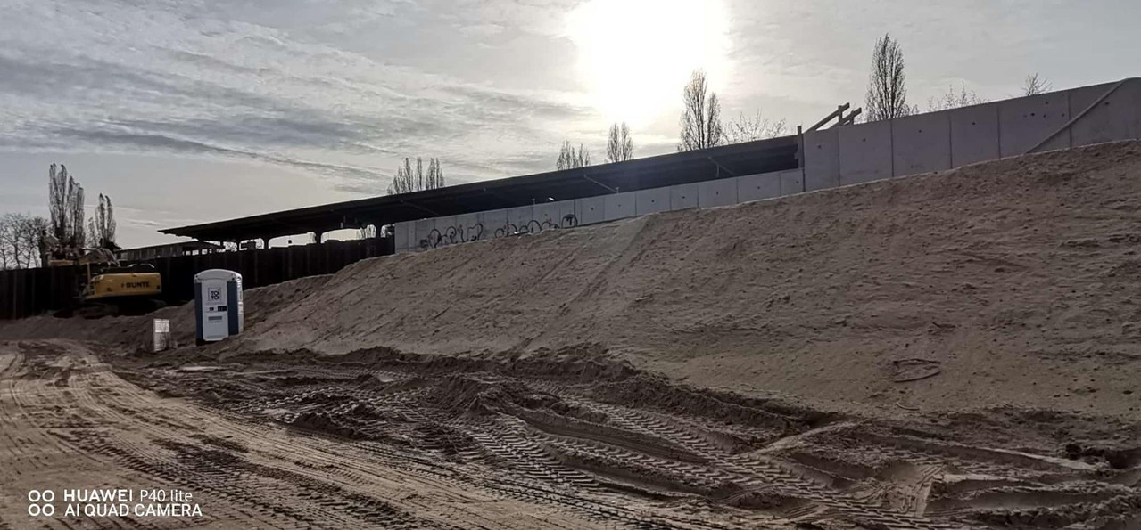 Hier scheint man soweit fertig zu sein. Die alte Spundwand/Uferlinie ist komplett zurückgebaut und verschwunden, hinter der neuen zurückgesetzten Spundwand wartet die frische Böschung auf ihren Bewuchs. Noch ist ein Ponton mir Bagger vor Ort, daher ist die neue Fahrrinne wohl noch nicht freigegeben:
