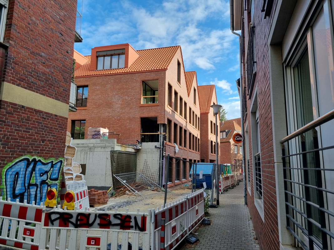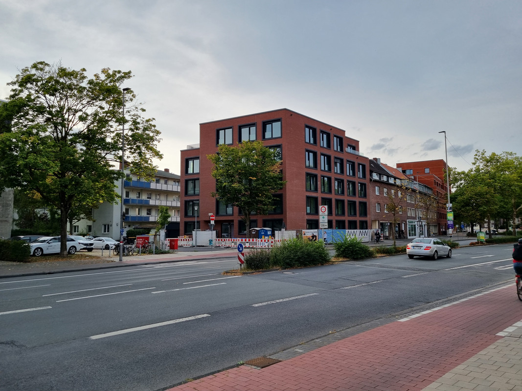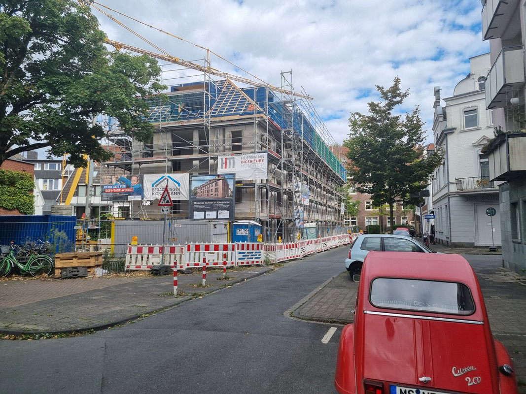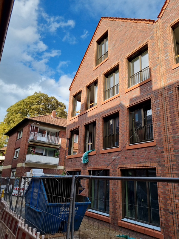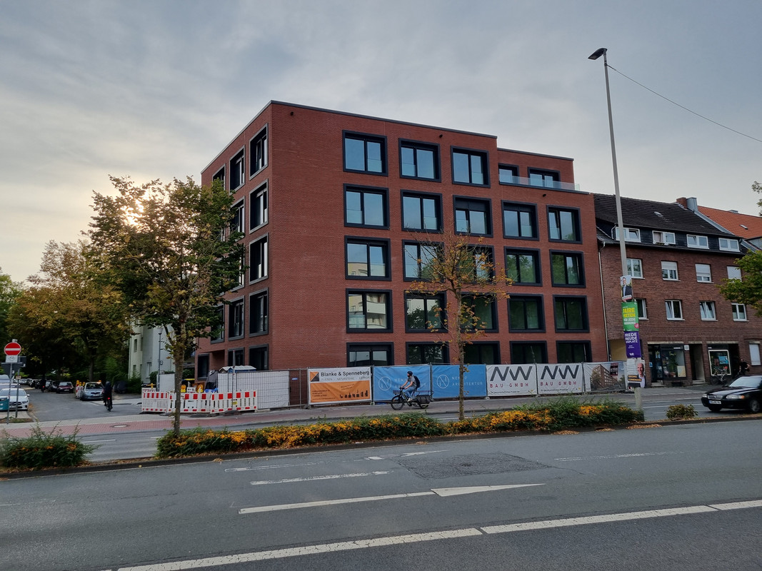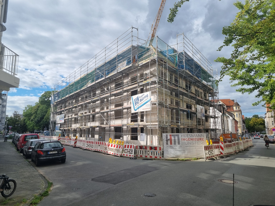 Und ich verstehe nicht, wieso man in MS nicht mehr auf ein zuästzliches Stockwerk an der Kopfseite von Gebäuden setzt. Der Riegel als Nachbar hätte das durchaus zugelassen und man hätte 2 WE mehr rausholen können. Außerdem wäre die Kreuzung reizvoller geworden.