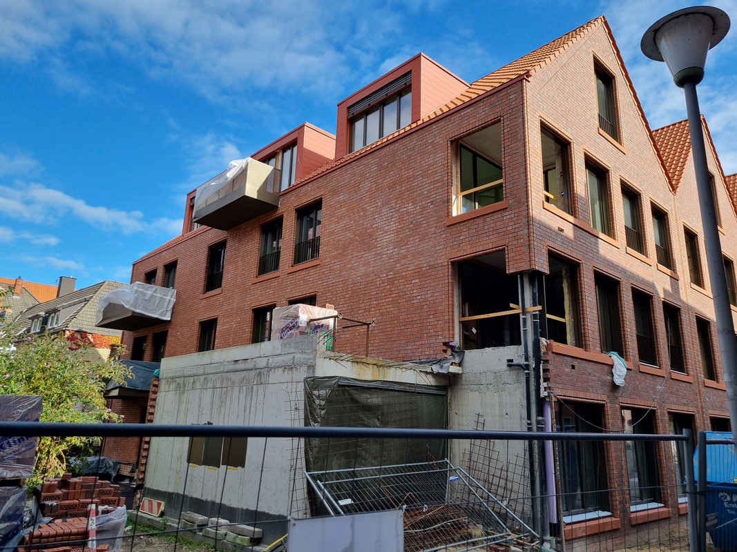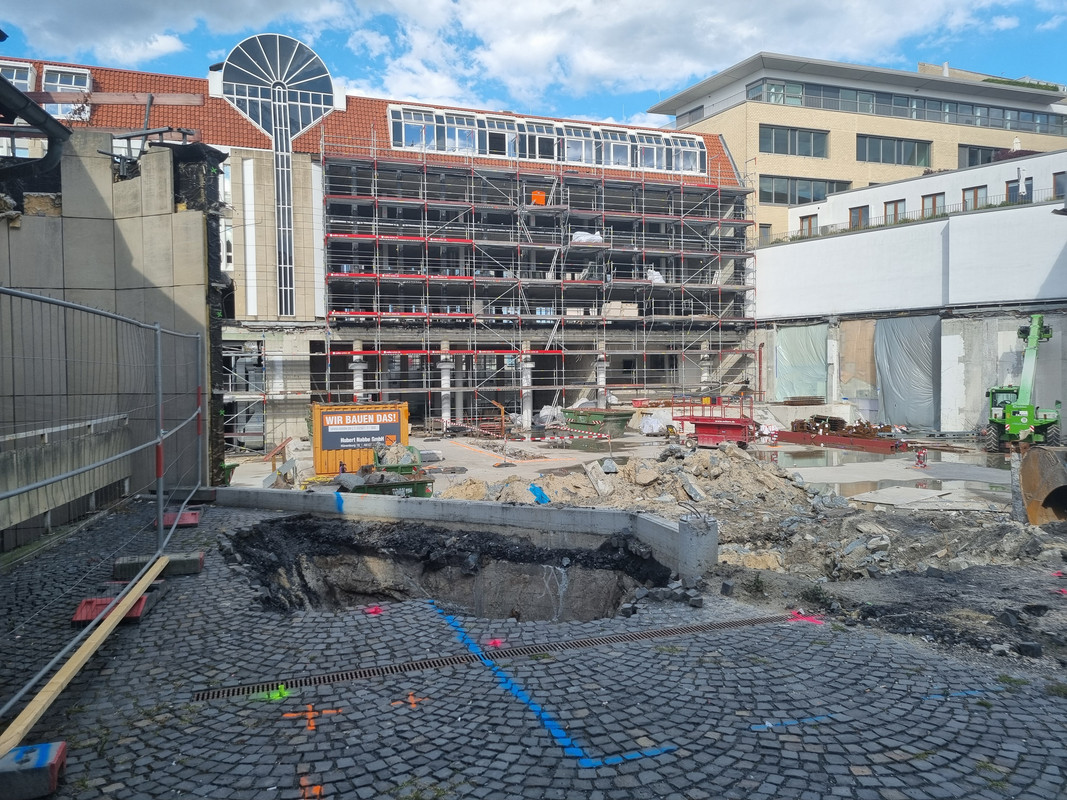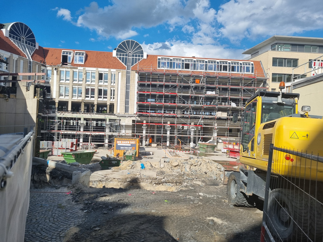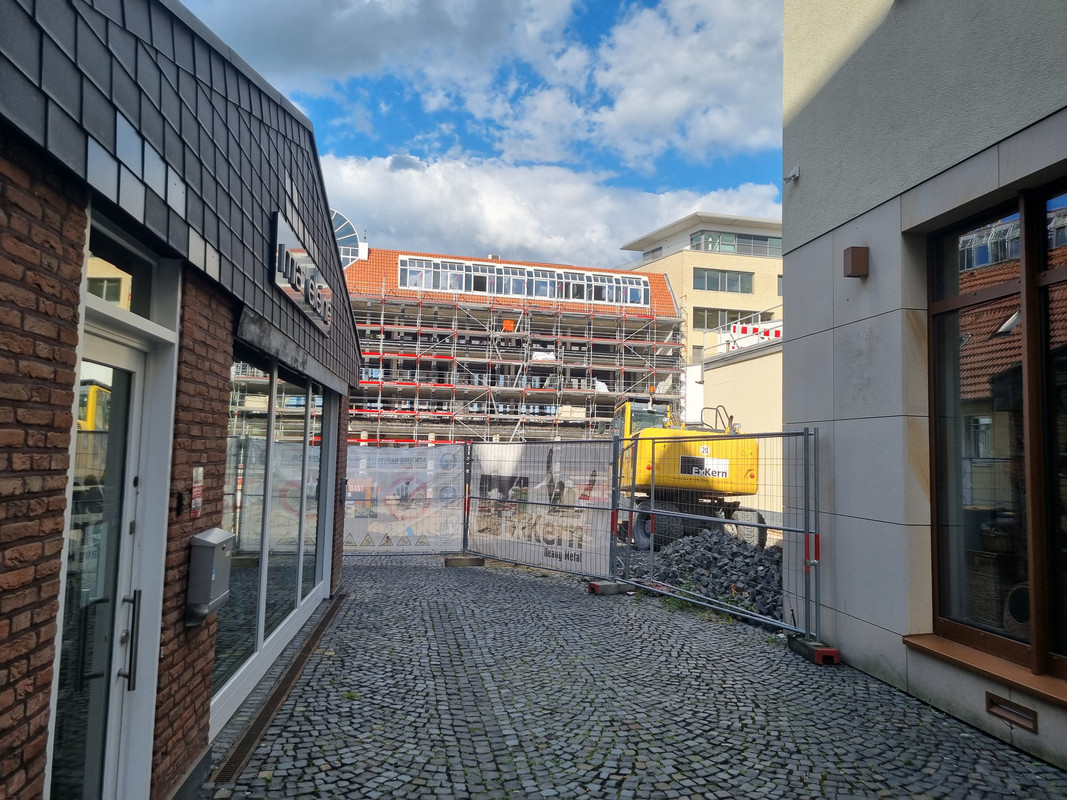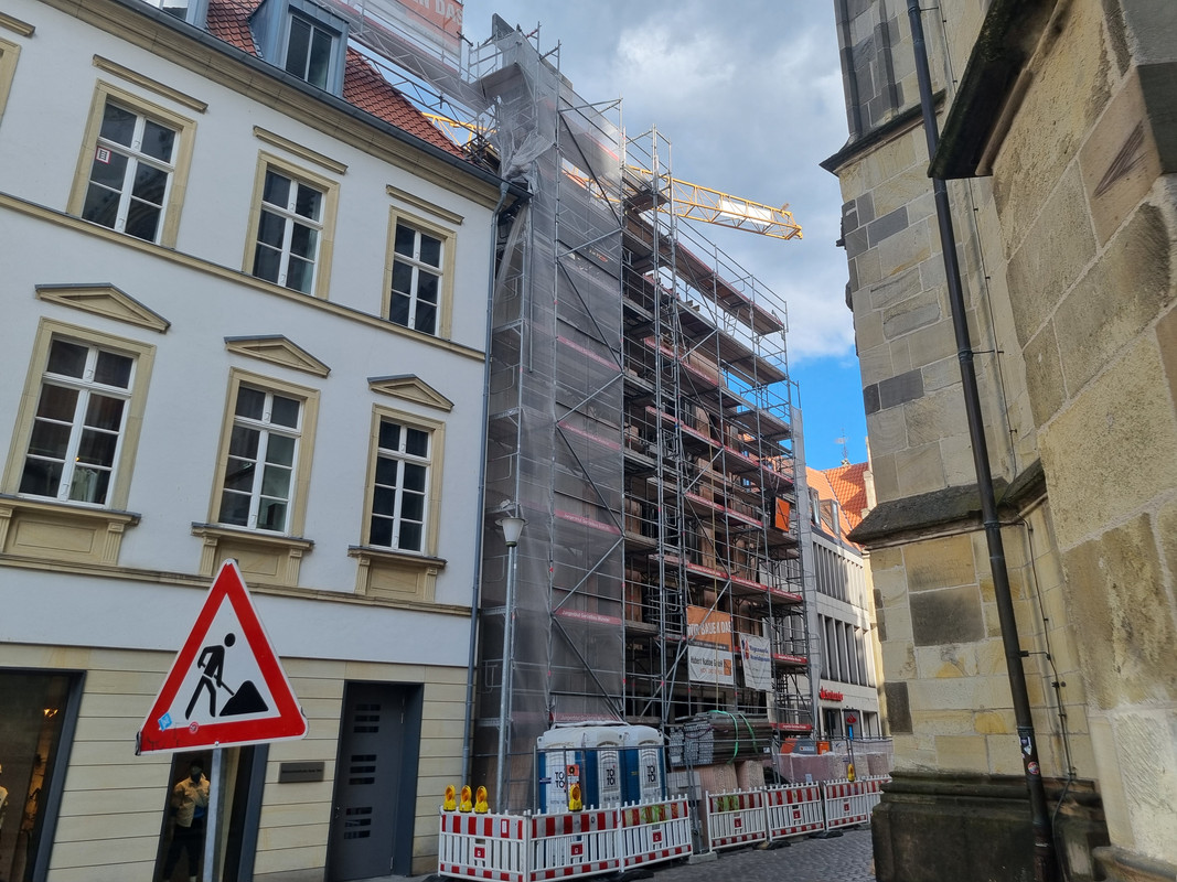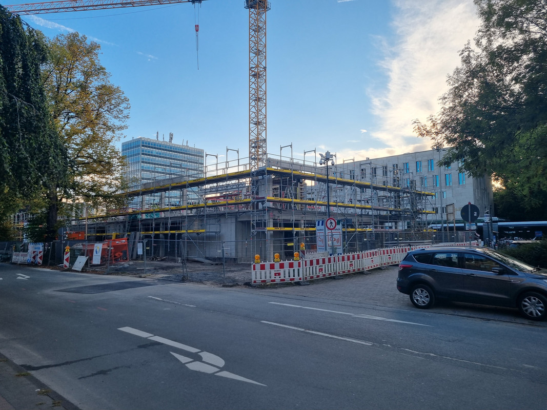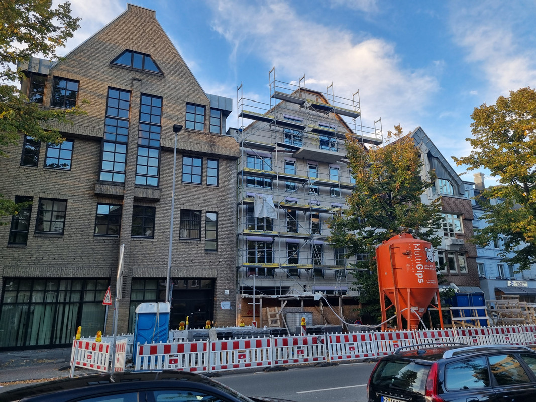 Der Altbau wurde immernoch nicht gereinigt, aber er ist ja auch noch nicht fertig. Der Neubau wird dagegen abgerüstet und zeigt sich recht schlank und mit Sockelzone. Hier wurde für das Budget eine ordentliche Fassade und Kubatur realisiert. Der Neubau nimmt dann auch teilweise stilistisch den Altbau mit.