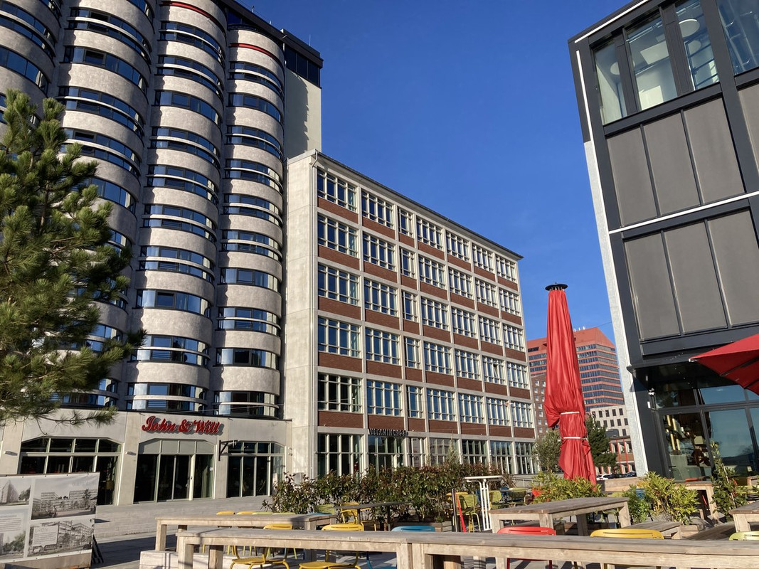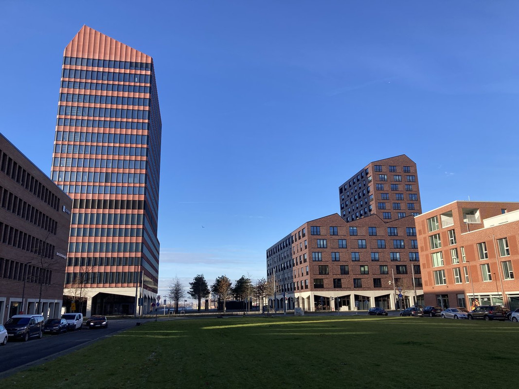 Vollkommen richtig beobachtet, Barackenpapst. Das Problem der Überseestadt ist, dass es ursprünglich aufgrund des Widerstands der noch ansässigen Hafenwirtschaft als reines Gewerbegebiet geplant war. Das sieht man dem erst nachträglich und zähem Ringen in sehr limitierten Gegenden erlaubten Wohnbereichen auch an. Die Planung all dessen, was bis etwa 2015 projektiert wurde (das ist immer noch ein Großteil der Projekte, sogar noch eines Teils der erst jetzt im Bau befindlichen) atmete noch diesen "Gewerbegebietsgeist" mit großen Parzellen und einem freundlich gesagt gegenüber 1965 nur geringfügig weiterentwickelten Städtebau.