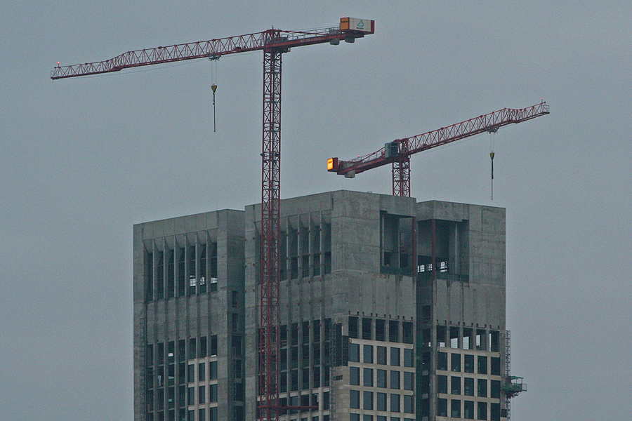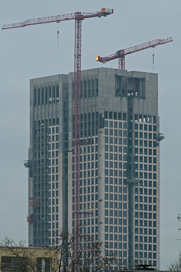Sehr wenig Zeit und ein äußerst bescheidenes Wetter machen Updates selten zur Zeit, wenigstens meinerseits. Hier ein Distanzschuß von gestern spät nachmittag bei schlechtem Licht von der Tower 185 Baustelle. Die Turmspitze ist komplett von der Kletterverschalung befreit, die interessante Einteilung innerhalb der Krone kann man auch erkennen.
