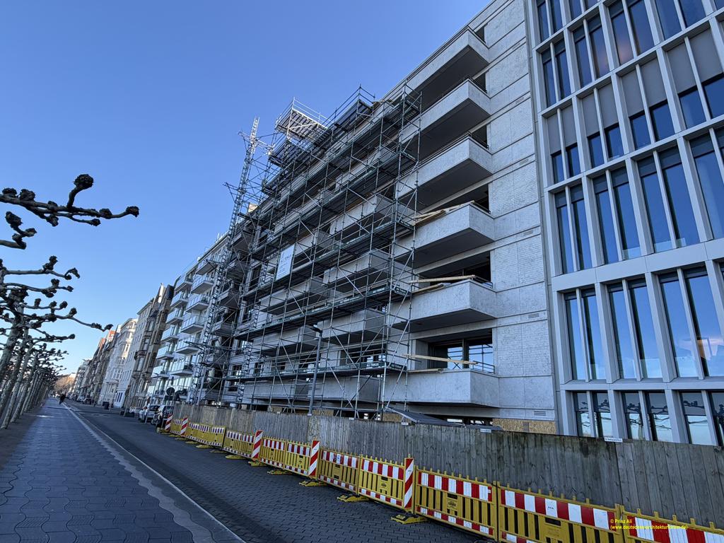 Sie reiht sich nun entlang der Rheinuferpromenade mit den unterschiedlichsten Gebäudestrukturen modern ein. Wenn man es allerdings auf den negativen Nenner bringen möchte, haben diese schießschartenartigen Fassadenteile hier gerade noch neuzeitlich gefehlt. Die Rheinseite fällt durch ihre Schlichtheit auf, das hohe Atrium lässt sich nicht sofort erkennen. Das Gebäude macht dagegen aus der Entfernung durch seinen auffälligen Dachabschluss gesamtheitlich einen guten Eindruck. Die verbauten Materialien dürften allein schon durch die Lage direkt am Rhein sehr hochwertig sein. Das trifft auch auf das sich anschließende Wohnhaus zu.