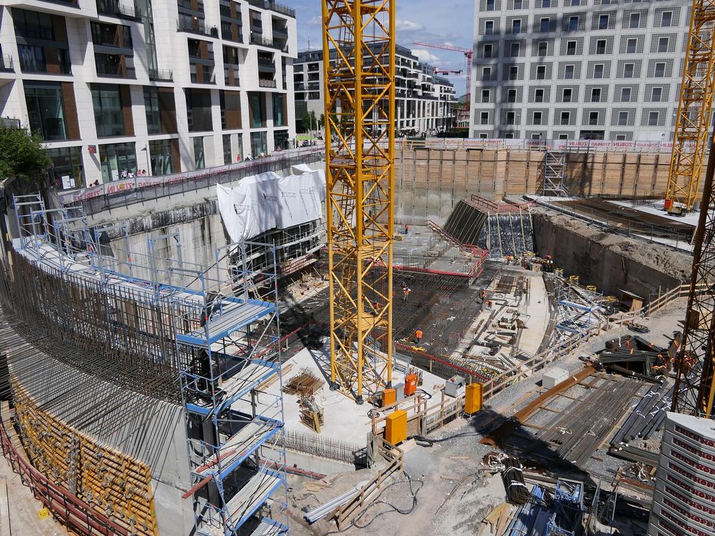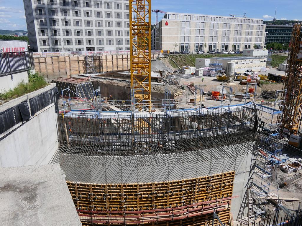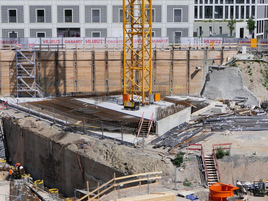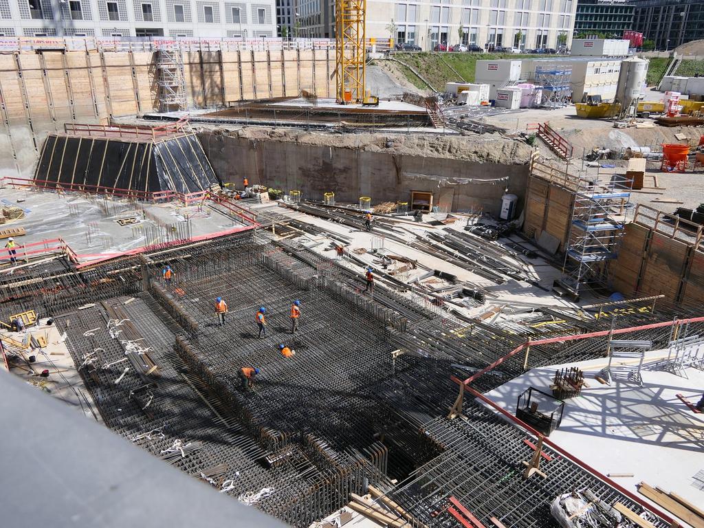 Man arbeitet übrigens inzwischen sehr fleißig an den Fundamenten. Es wird sehr viel Armierungseisen verbaut, ich nehme mal an auch um keine Last auf den U-Bahn-Tunnel zu bringen der sich durch das Baufeld zieht. Ist übrigens spannend zu sehen wie nah an den Tunnel ran gebaut wird.