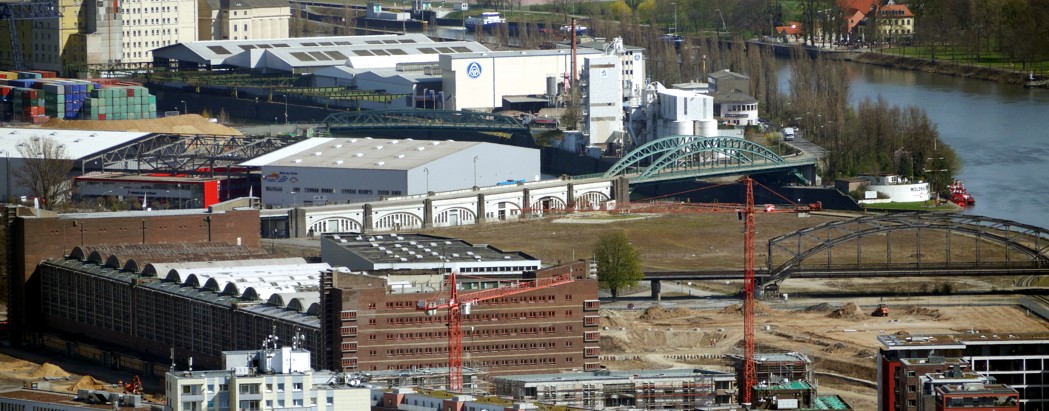 Die Stadt hat das Büro Ferdinand Heide, Frankfurt, damit beauftragt, die Bebaubarkeit des Molenkopfs des Osthafen-Unterhafens zu untersuchen. Zu klären war, ob ein etwa 60 Meter hohes Hotelhochhaus, so wie es der neue Hochhausrahmenplan vorsieht, an dieser Stelle (roter Kreis auf diesem Luftbild) überhaupt möglich wäre. Das Ergebnis liegt nun vor. Demnach hält Heide ein Hochhaus auf der Molenspitze für uneingeschränkt möglich. Die Stadt möchte nun eine Ausschreibung starten. Anschließend soll ein Architekturwettbewerb zur Gestaltung des Hochhauses ausgerichtet werden.