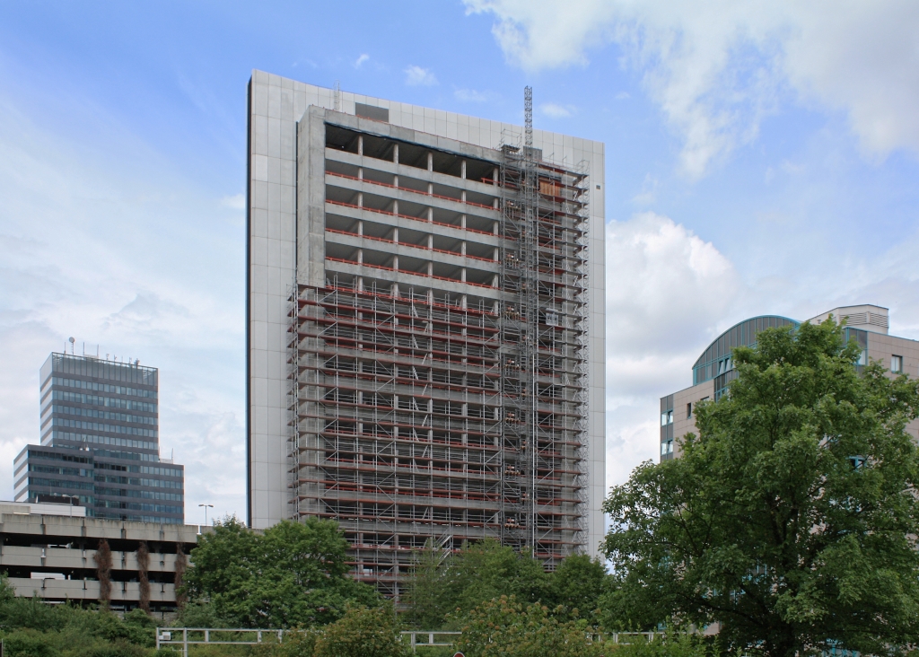 Der Umbau der 73 Meter hohen Lyoner Straße 40 in ein Wohnhochhaus, dazu oben #214 und #226, läuft seit einiger Zeit. Die unteren Geschosse sind zurück im Rohbauzustand: