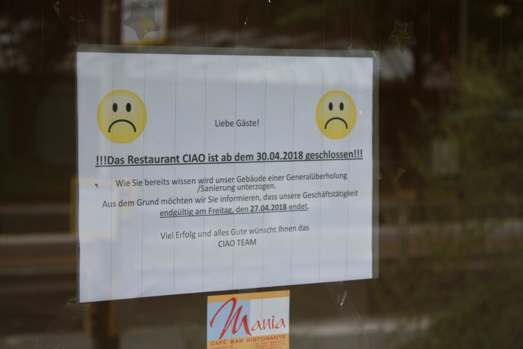 Die angekündigten Baumaßnahmen zur Sanierung des Gebäudes Lyoner Straße 11 (siehe auch #196) scheinen Konturen anzunehmen. Das italienische Lokal schließt zum Monatsende (mit dem Hinweis an der Tür: "wegen der anstehenden Sanierungsmaßnahmen"). Die Bank-Filiale ist vor geraumer Zeit ausgezogen und auch die kleine Post-Filiale hat die Straßenseite gewechselt und findet sich jetzt im Gebäude Lyoner Straße 14. Friseur und Suppen-Bar sind damit die letzten Mieter im EG.