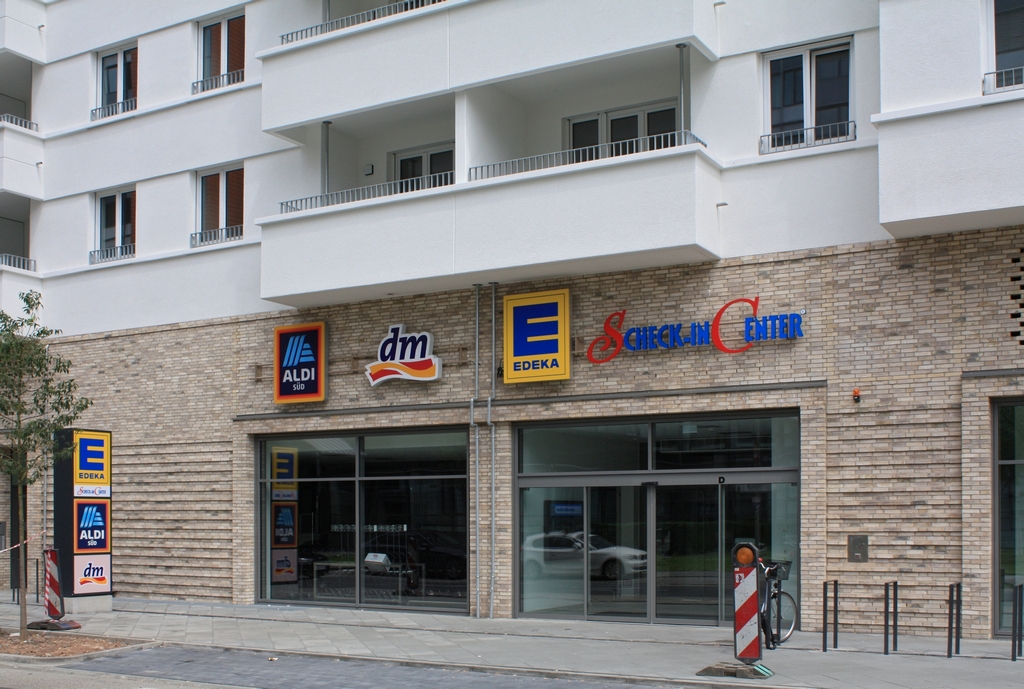 Mit gemeinsamem Eingang - neuer Einzelhandel an der Hahnstraße 37-41 (das Scheck-in-Center war zum Zeitpunkt der Aufnahme noch nicht eröffnet):
