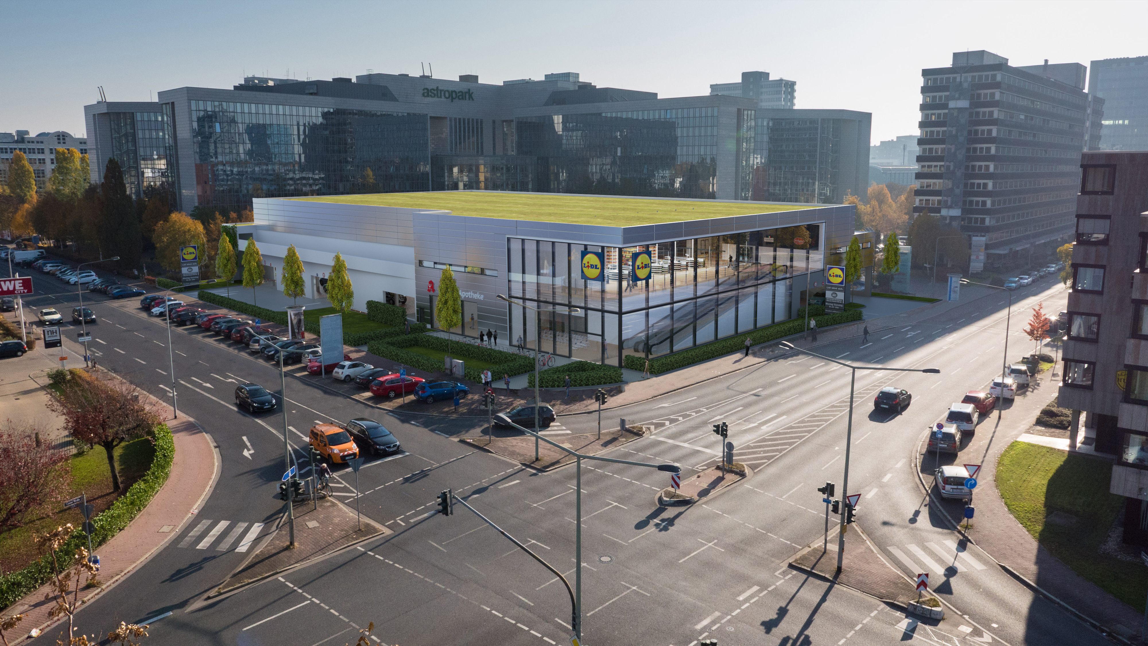 In Niederrad wird auch Platz für eine Apotheke sein. Spätestens im Dezember ist die Fertigstellung des Neubaus geplant (Q). Visualisierung, Klick vergrößert: